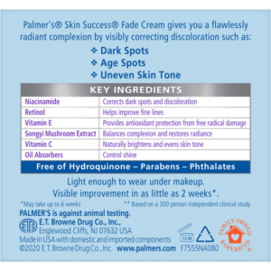 Palmer’s Skin Success Fade Cream gives you a flawlessly radiant complexion by effectively correcting discoloration such as dark spots, age spots and uneven skin tone. This cream is formulated specifically for oily skin and controls shine by leaving a matte finish.