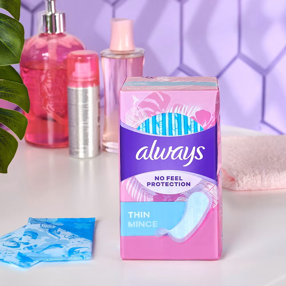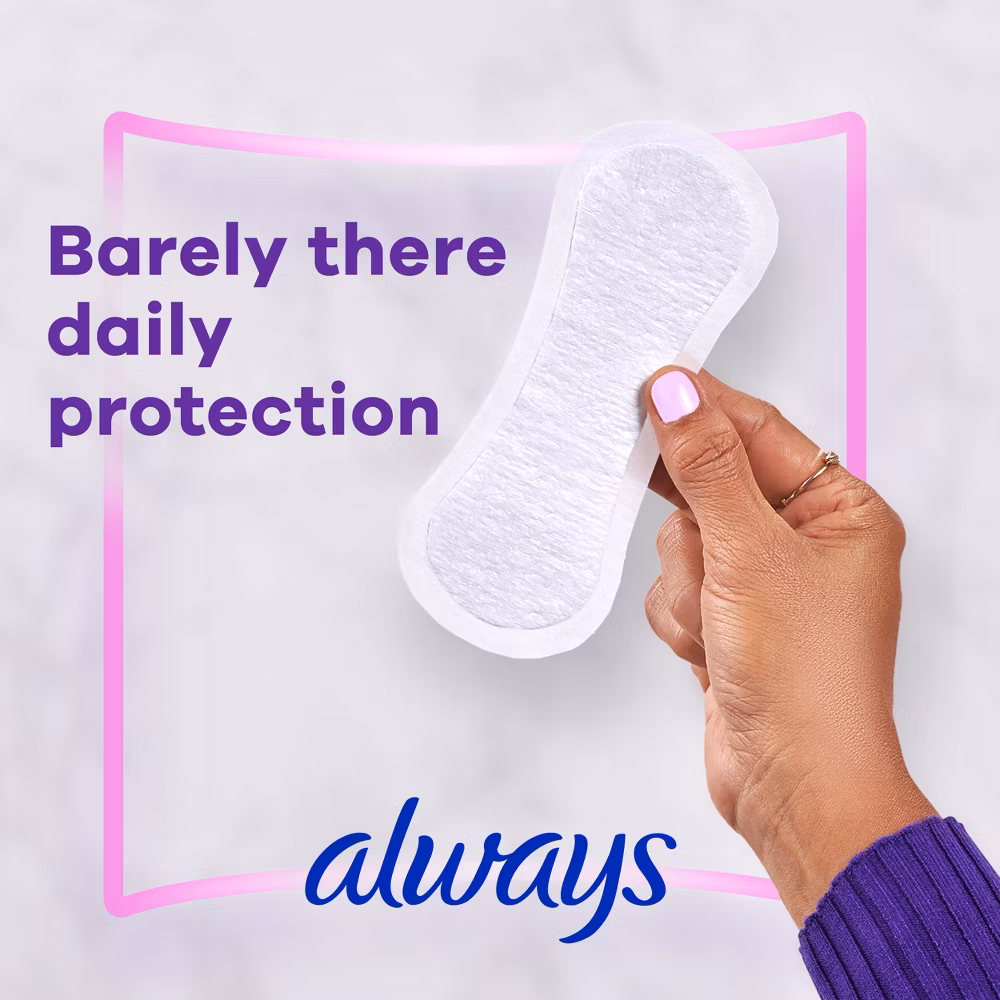 Want to feel fresh all day no matter what you do? Discover Always Thin No Feel Protection Daily Liners Regular for discreet protection against daily discharge and odors. These pantiliners are made to be thin and absorbent for everyday freshness. Plus, Always thin daily liners feature a special Edge-2-Edge adhesive that holds better than traditional adhesives. That means once the liner goes on, you can trust that will stay in place no matter what activities you take part in. Errands, exercise, sports, and other physical activities won’t stand a chance against this superior adhesive option. There’s no reason to worry about what your day will entail because these panty liners won’t budge. Designed with a breathable layer to help keep you dry. They are individually wrapped for comfortable protection on the go, so you can take them anywhere. The Always Liners Fit sizing chart shows a range of liners for different shapes and needs for you to find your best fit. Get daily protection against discharge and odors that is so discreet you won’t even know it’s there. Thin and discreet, Always No Feel Protection Daily Liners are designed to offer effective, safe, and comfortable protection no matter where your day takes you.