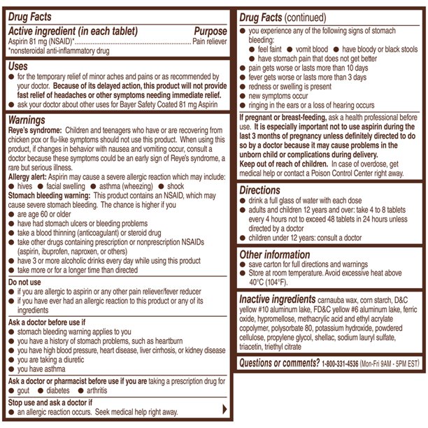 - Aspirin Regimen Bayer Low Dose Pain Reliever Enteric Coated Tablets, 81mg, 120 Ct: