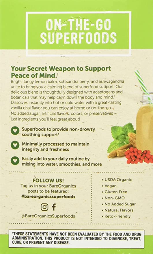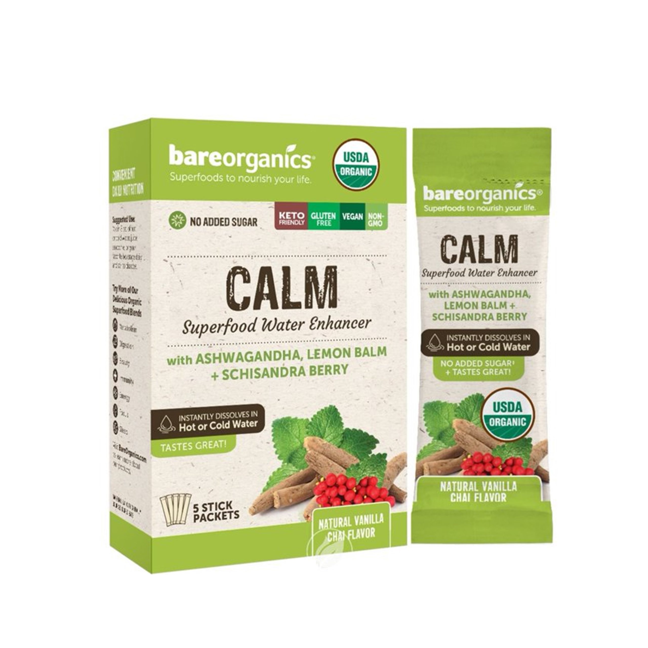 Meet your new secret weapon for occasional stress support This delightful blend is thoughtfully designed with adaptogens and botanicals that may help calm down your body and mind, including Schisandra berry, lemon balm, and ashwagandha.+ With a natural, delicious vanilla chai flavor, our Calm Superfood Water Enhancers offer a tasty, nutritious way to enjoy the benefits of these superfoods with the convenience of a daily beverage.
