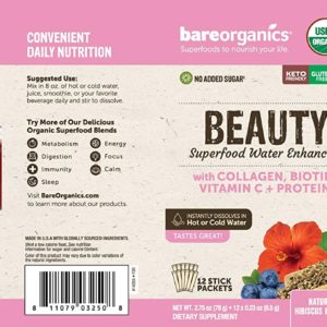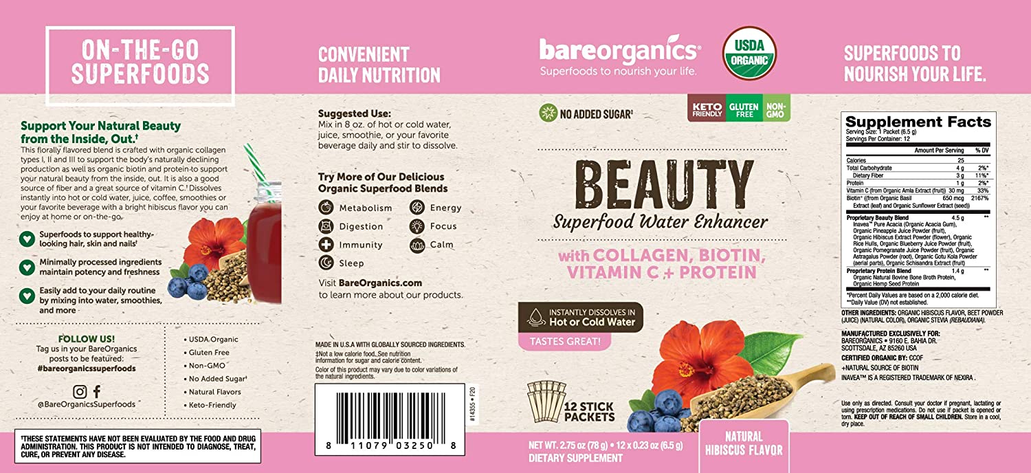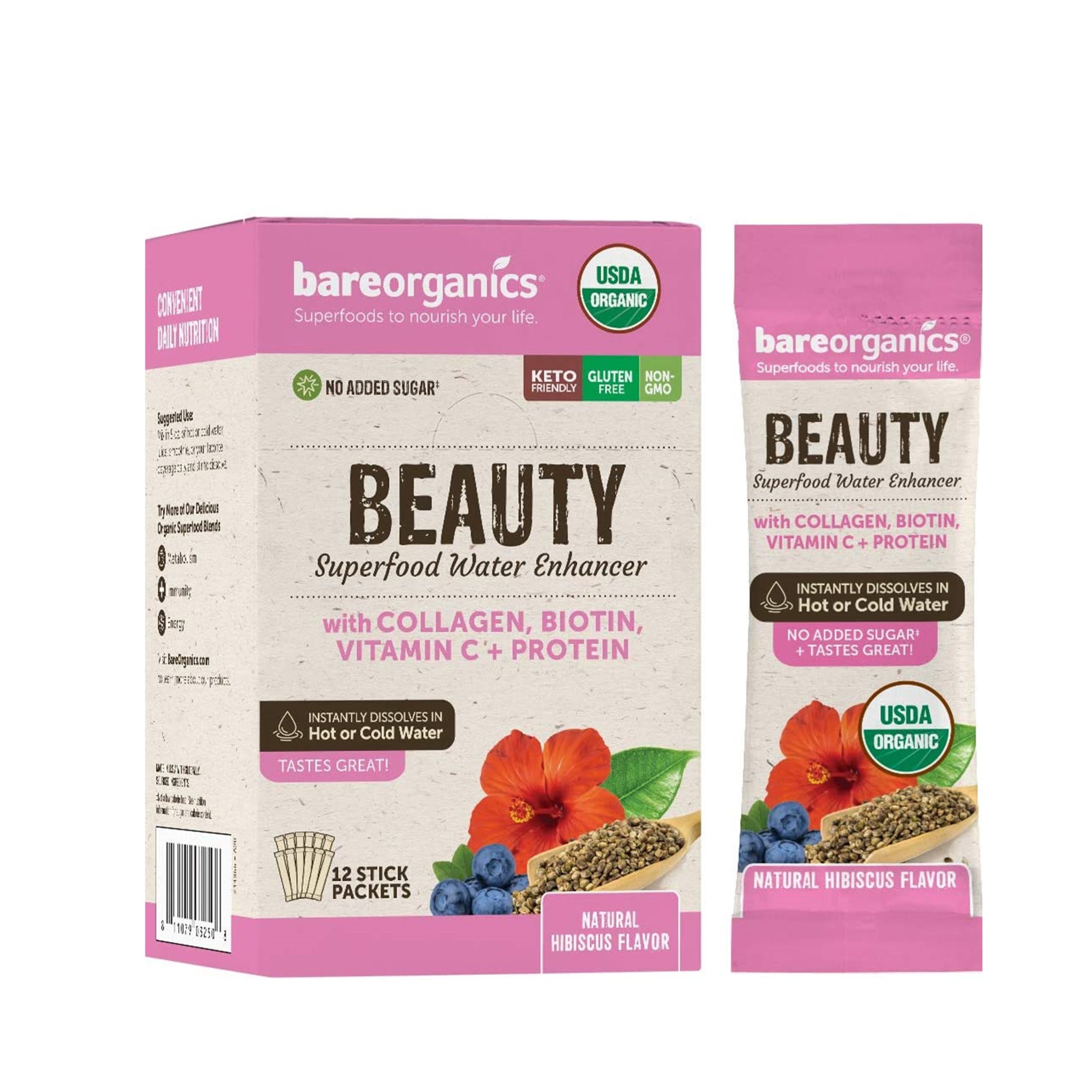 Bareorganics On-The-go Beauty Superfood Drink Mix (Organic) (12 Stick Packs), Hibiscus