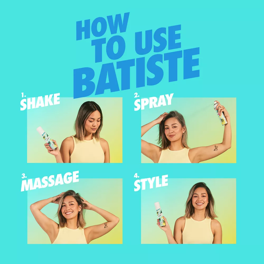 Take your hair from flat to fab with Batiste Fresh Dry Shampoo. Our waterless formula targets excess oil and grease at the roots. Batiste Fresh locks in subtle scents of pink grapefruit, orange blossom, and jasmine that never overpower. Just spray in, massage, style, and go. Batiste Dry Shampoo instantly makes your hair feel clean, fresh, with added body and texture. Perfect for the girl-on-the-go, use Batiste Dry Shampoo between washes to keep your hair looking fresh and fabulous without the effort. Let’s face it, life gets crazy sometimes and skipping a wash (or two) is inevitable. With Batiste Dry Shampoo, you can be confident your hair looks great no matter what life throws your way.