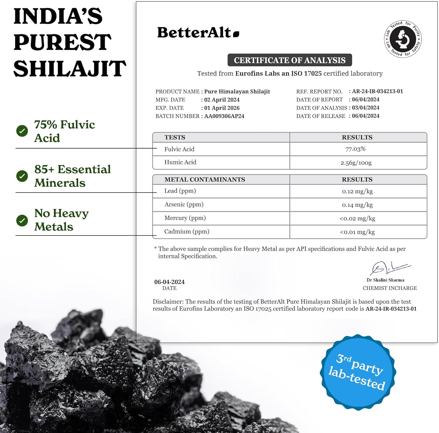 Better Alt Pure Himalayan Shilajit Resin | High Potency for Men & Women | 75 Servings for Stamina and Muscle Building, 85+ Trace Minerals, 75% Fulvic Acid, with Lab Test Report, 400mg