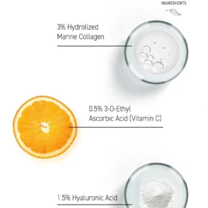The Hero Ingredients: HYDROLYZED MARINE COLLAGEN 3% + HYALURONIC ACID 1.5% + VITAMIN C 0.5%