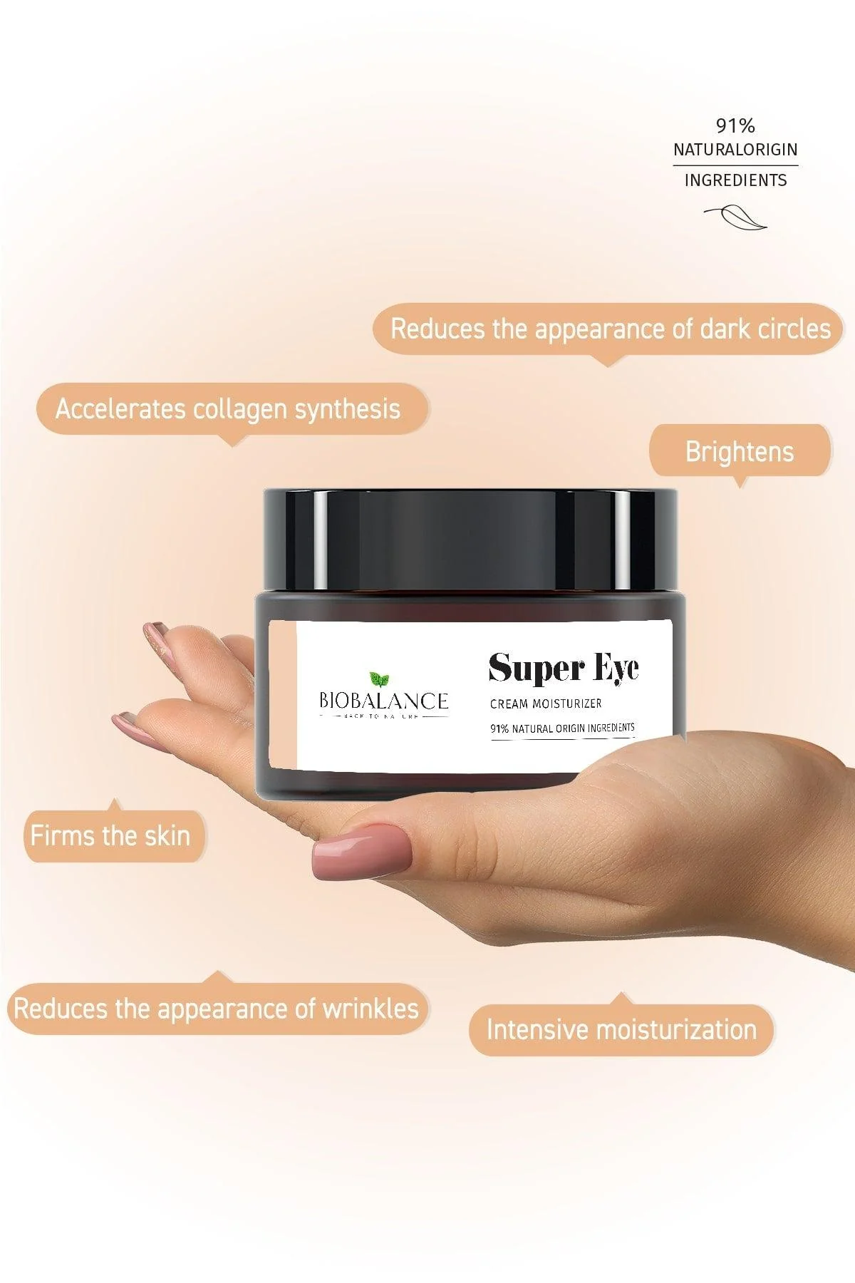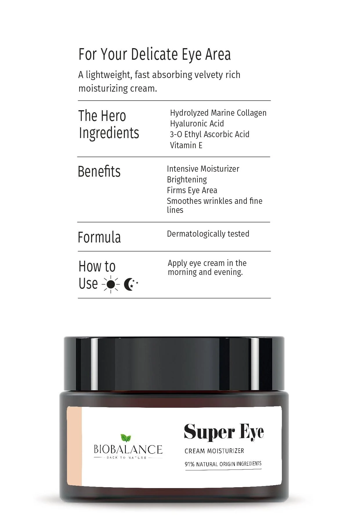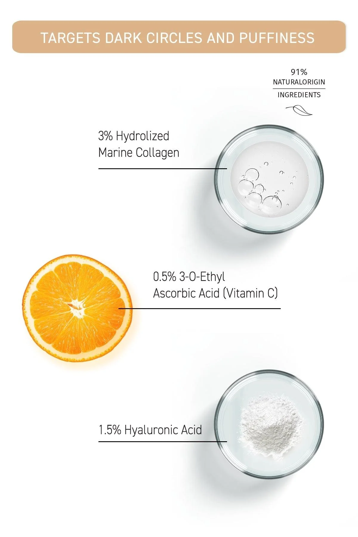 • Vitamin C (3-O-EAC) brightens eye contour and reduces dark circles