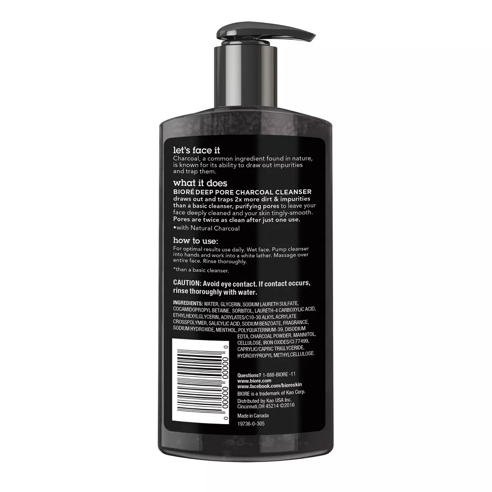 Biore Deep Pore Charcoal Cleanser is an acne cleanser for Oily Skin. It purifies pores and deeply cleanses skin. With natural charcoal, known for its ability to draw out and trap impurities and skin purifying technology, this cleanser deep cleans 2 times better than with a basic cleanser. The innovative black cleanser foams white and rinses clean, leaving skin refreshed and tingly smooth. Use this salicylic acid face wash to help treat acne and blemishes that start from impurities and pollutants under the skin. Biore Skincare targets the root of all skin problems—the evil clogged pore. So when it comes to dirt and oil we take a no nonsense approach to fight smarter, not harder. Our scrub, liquid, powder, strip, mask and bar cleansing products go straight to the source of those pesky pores for deeply clean, beautiful skin. Satisfaction Guaranteed. Limitations may apply.