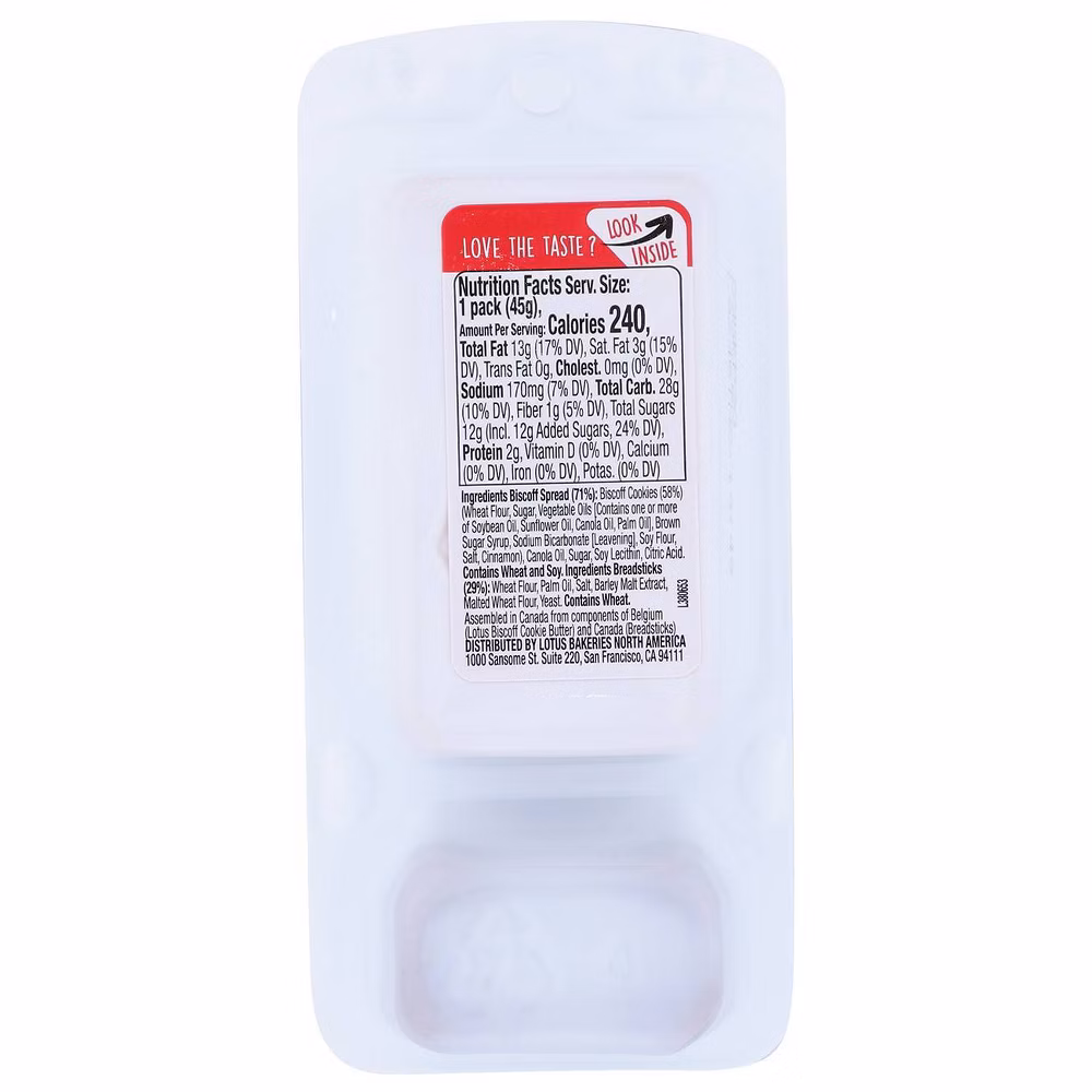 ingredients biscoff spread (71 %): biscoff cookies (58%) (wheat flour, sugar, vegetable oils [contains one or more of soybean oil, sunflower oil, canola oil, palm oil], brown sugar syrup, sodium bicarbonate [leavening], soy flour, salt, cinnamon), canola oil, sugar, soy lecithin, citric acid., ingredients breadsticks (29%): wheat flour, palm oil, salt, barley malt extract, malted wheat flour yeast.