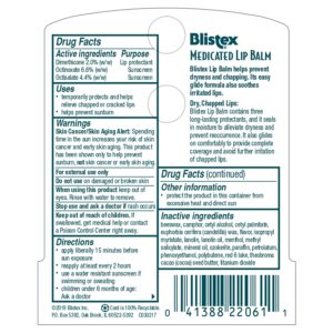 Blistex Medicated Lip Balm has three long-lasting protectants … it seals in moisture to prevent dryness, and soothes irritated lips. It glides on comfortably to help provide complete coverage and avoid further irritation of chapped lips. It provides SPF 15 sun protection.