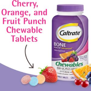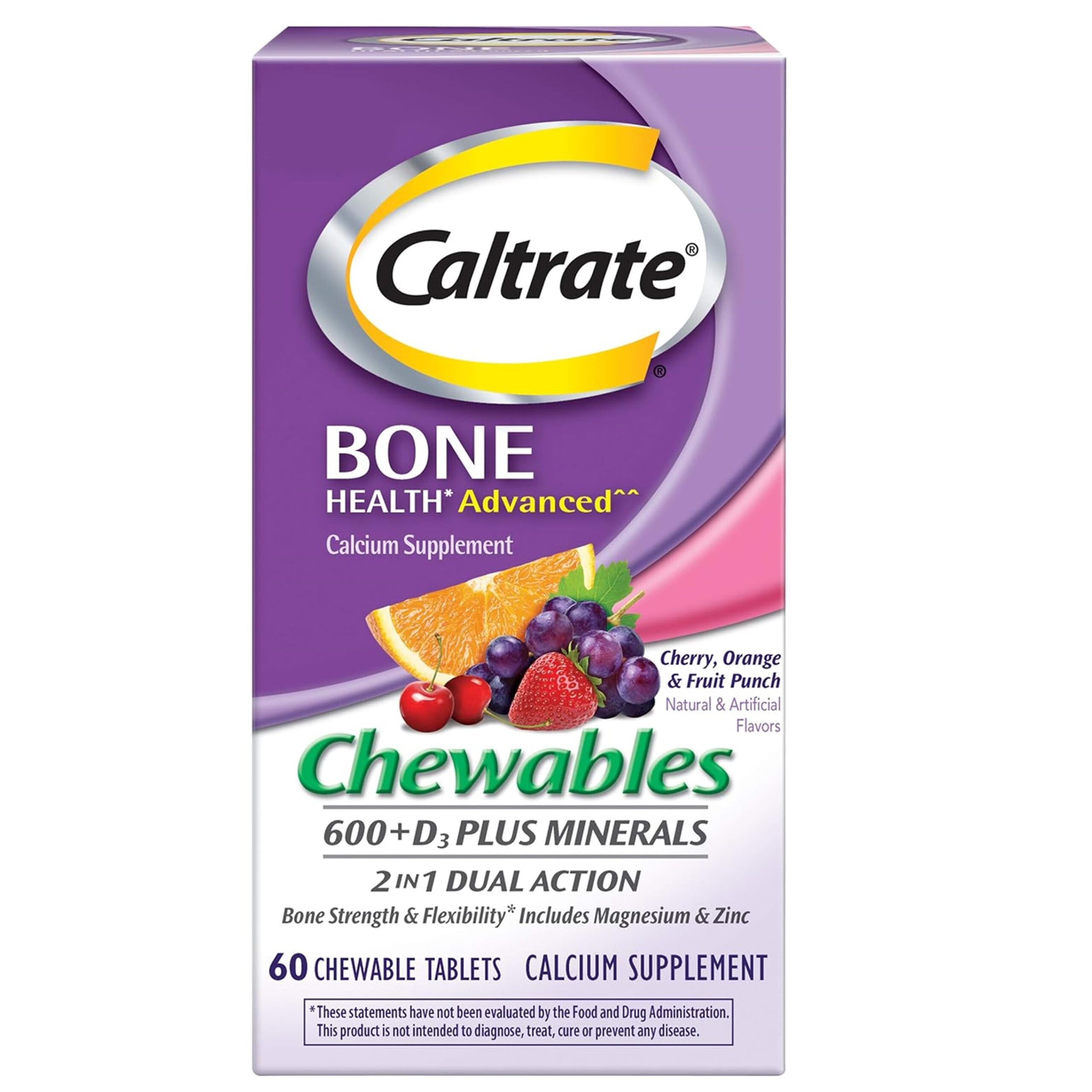 - 60 count bottle of Caltrate Chewables 600 Plus D3 Plus Minerals Calcium Vitamin D Supplement in cherry, orange and fruit punch flavors