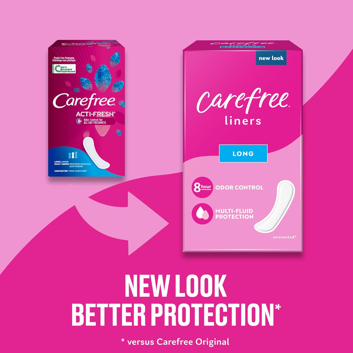 - NEW LOOK, BETTER PROTECTION – The Carefree liner you know and love, with a whole new look. 2x more absorbent vs. Carefree Original liners. Packaging may vary.
