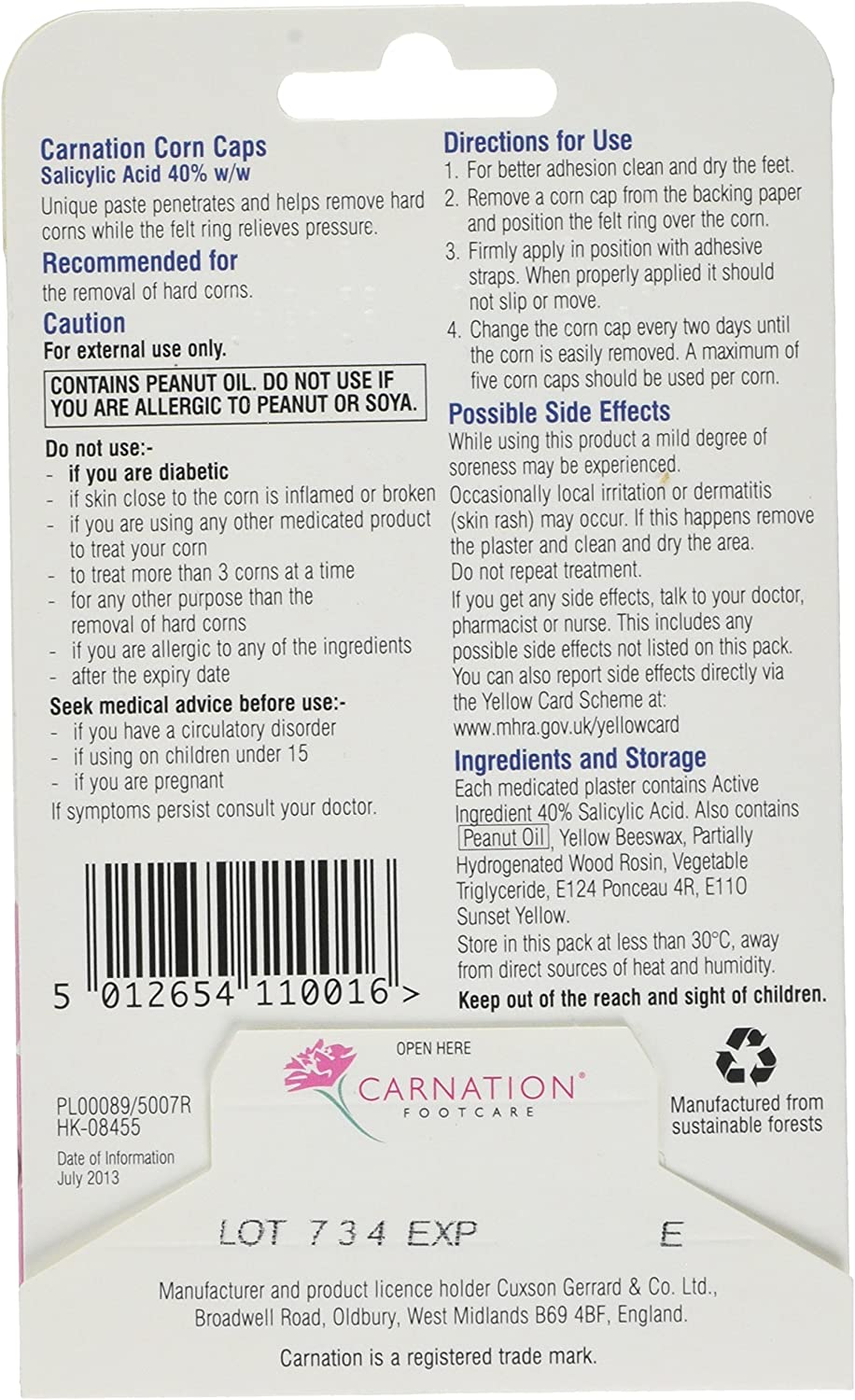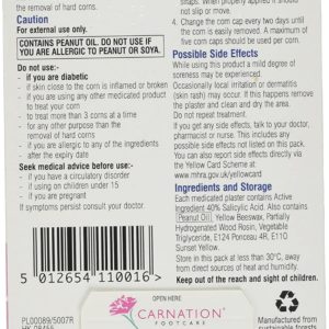 Carnation Foot care, leaders in innovative foot care products for good foot health. The Corn Caps are a unique way to get rid of painful corns. Combine a measured dose of Salicylic Acid ointment with a soft felt corn ring to relieve pressure whilst the corn is treated. Salicylic Acid loosens the intracellular cement holding hardened skin together allowing it to flake away, softening and loosening the nucleus to allow clean removal. Self-adhesive straps make Carnation Corn Caps easy to apply and hold firmly in place. A ten day treatment course is usually fully effective.
