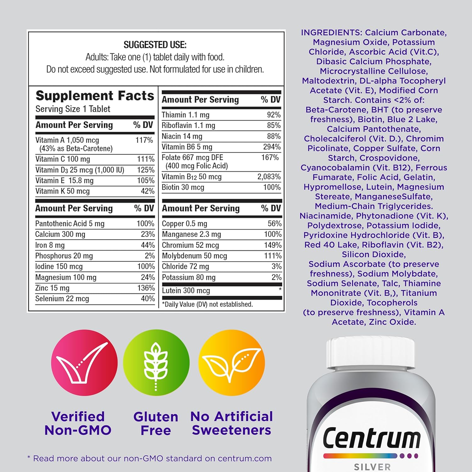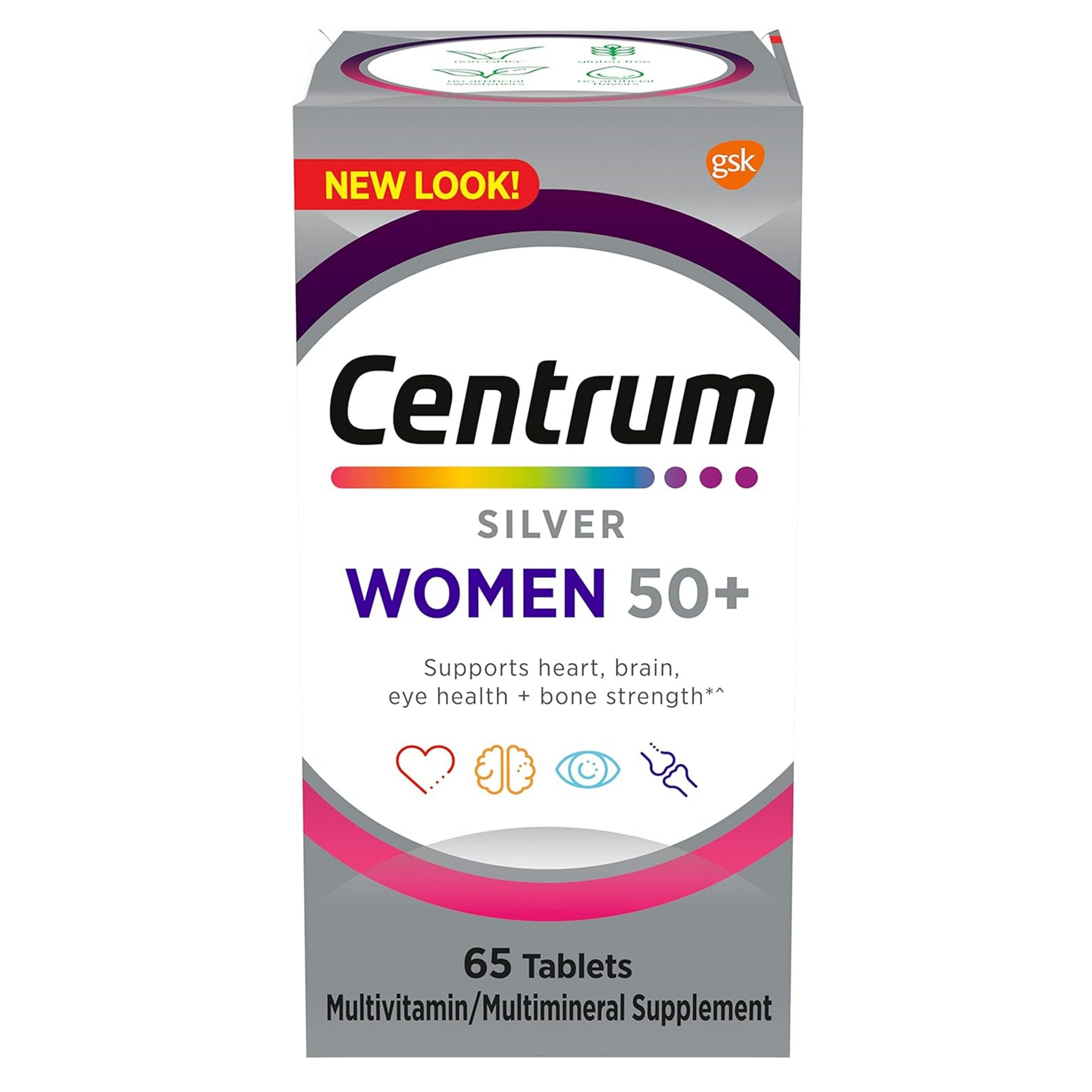 - One 65 count bottle of Centrum Silver Women’s Multivitamin for Women 50 Plus, Multivitamin/Multimineral Supplement with Vitamin D3, B Vitamins, Calcium and Antioxidant Vitamins C, E, and Beta-Carotene, and Zinc