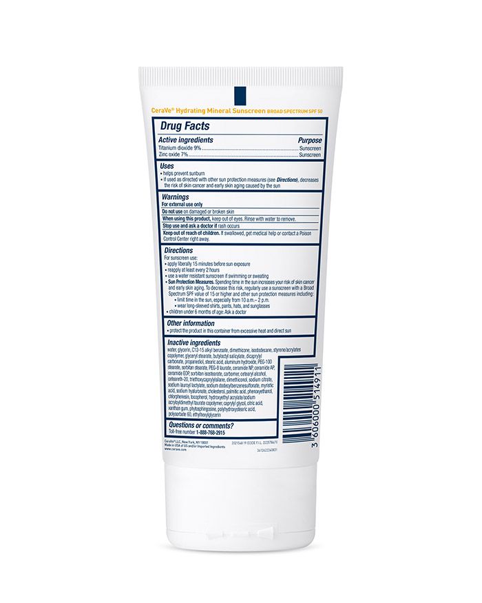 - Protect your skin from the sun’s damaging rays without irritation. CeraVe Hydrating Mineral Sunscreen Body Lotion with Broad Spectrum SPF 50 is a 100%-mineral sunscreen with titanium dioxide and zinc oxide that forms a protective barrier on your skin to help reflect UVA and UVB rays without irritating sensitive skin. Ideal for daily use, it also has three essential ceramides that help restore the skin’s natural barrier and lock in moisture.