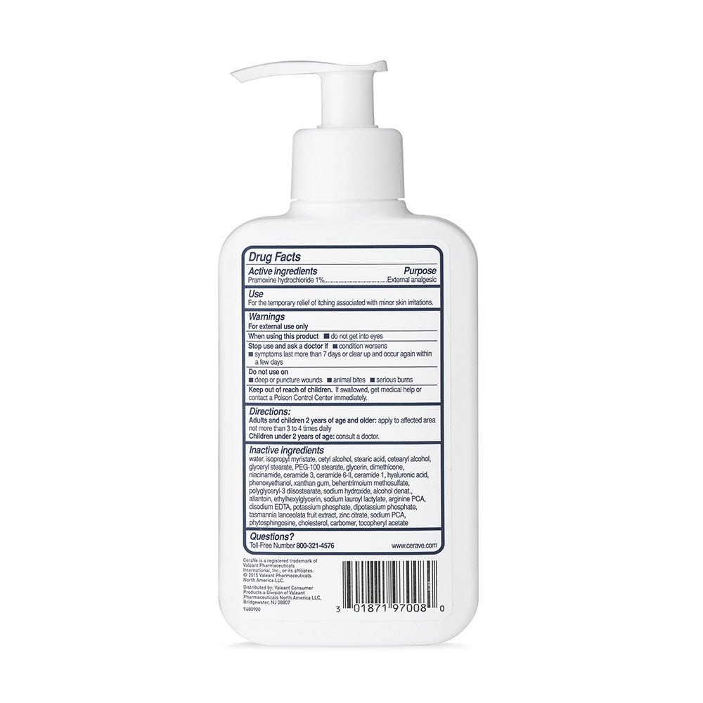 Developed with dermatologists. 1% pramoxine hydrochloride. External analgesic. Moisturizes dry skin. With 3 essential ceramides relieves itching associated with: insect bites, sunburn, poison ivy. Steroid free. Accepted National Eczema Association. nationaleczema.org. www,cerave.com. Questions or comments? Toll-free number 1-888-768-2915. A ofand/or imported ingredients.Drug FactsActive ingredient – PurposePramoxine hydrochloride 1% – External analgesicUseFor the temporary relief of itching associated with minor skin irritations