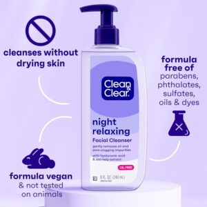 • 8-fluid ounces of Clean & Clear Night Relaxing Oil-Free Deep Cleaning Night Face Wash with hyaluronic acid and sea kelp extract to gently remove oil and pore clogging impurities