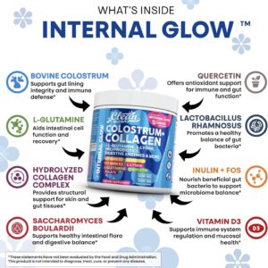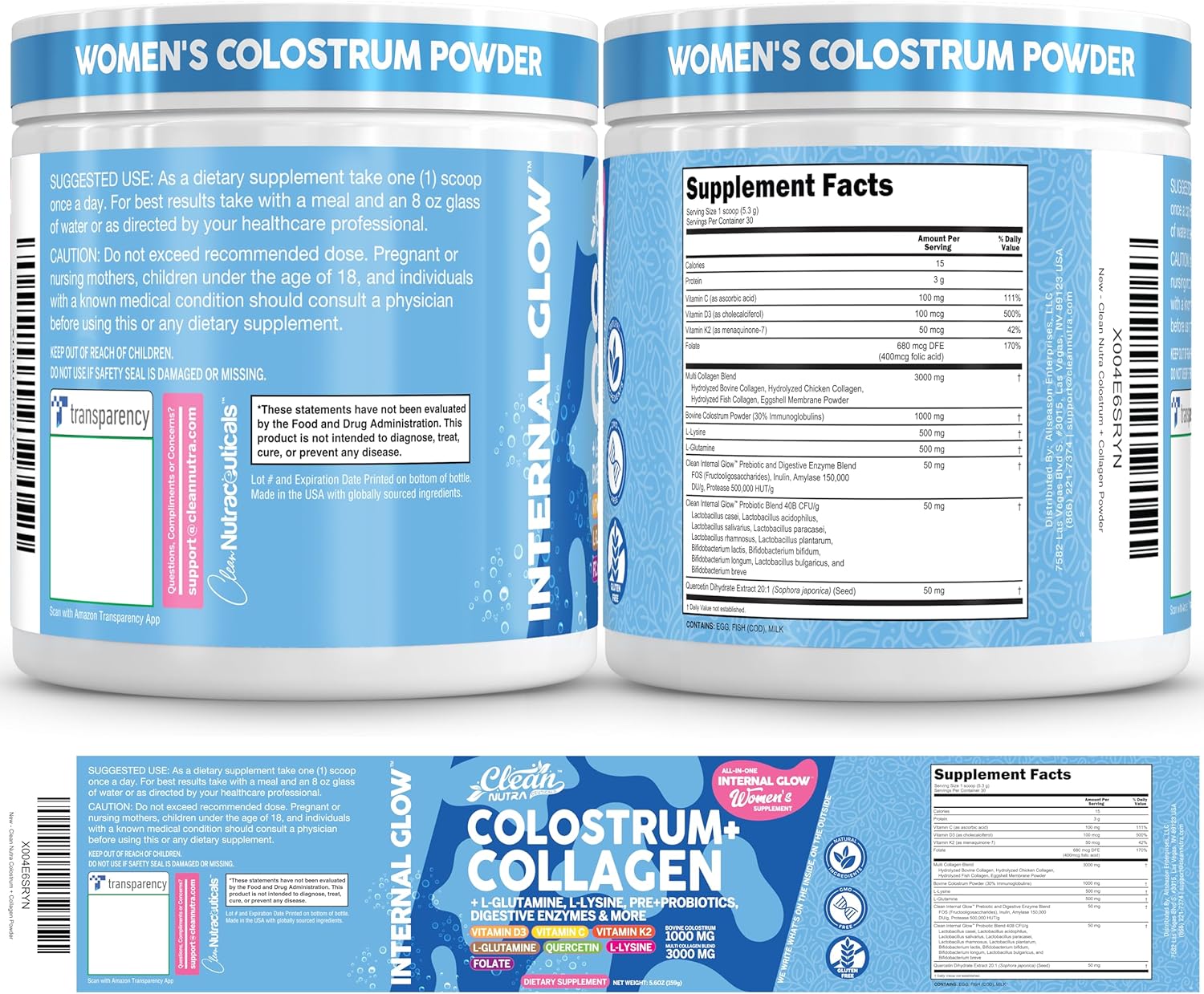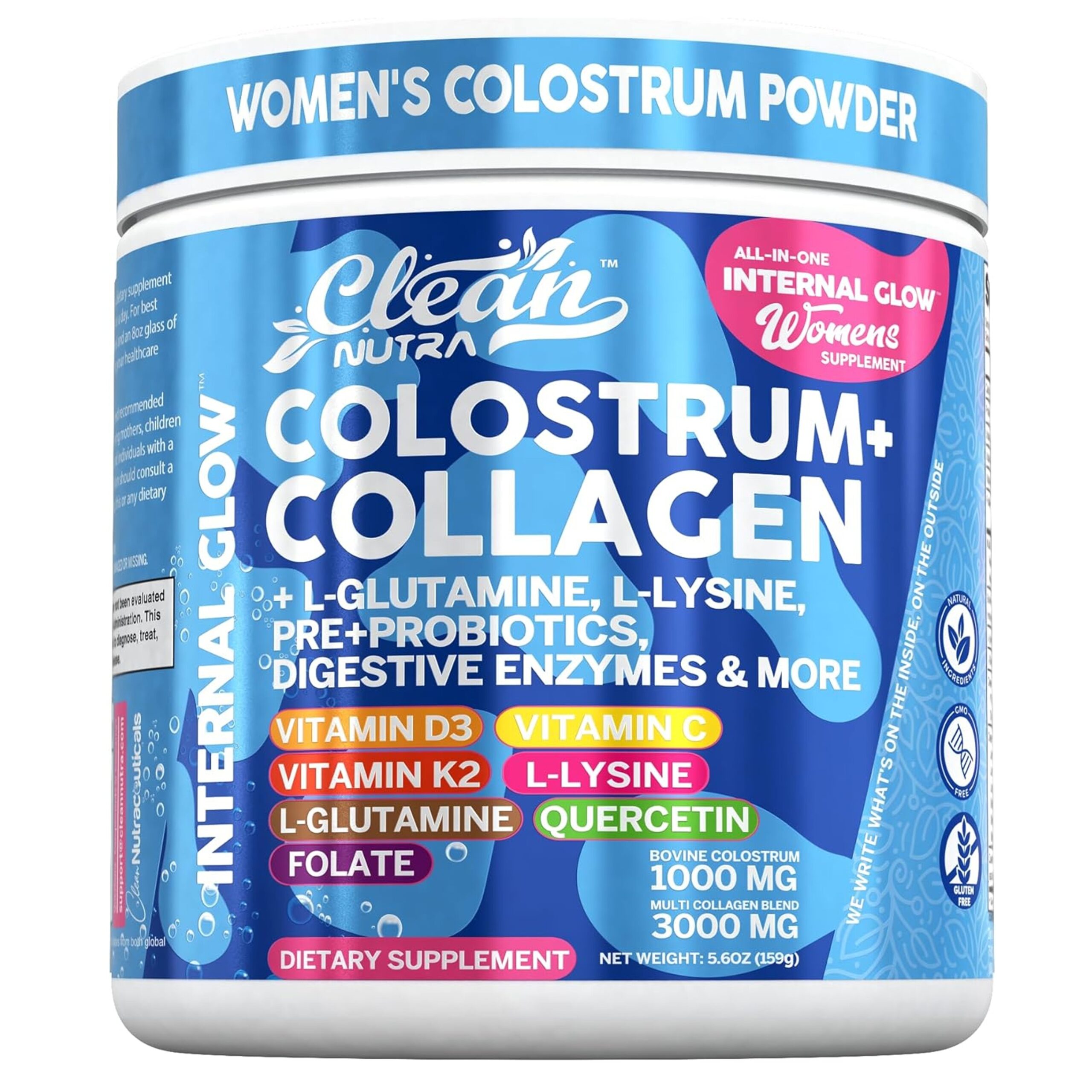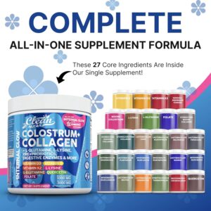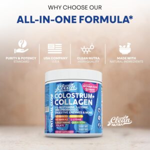 Clean Nutra Bovine Colostrum Powder + Collagen Peptides with L-Glutamine L-Lysine Prebiotics Probiotics Digestive Enzymes Vitamin D K2 C Quercetin & Folate |