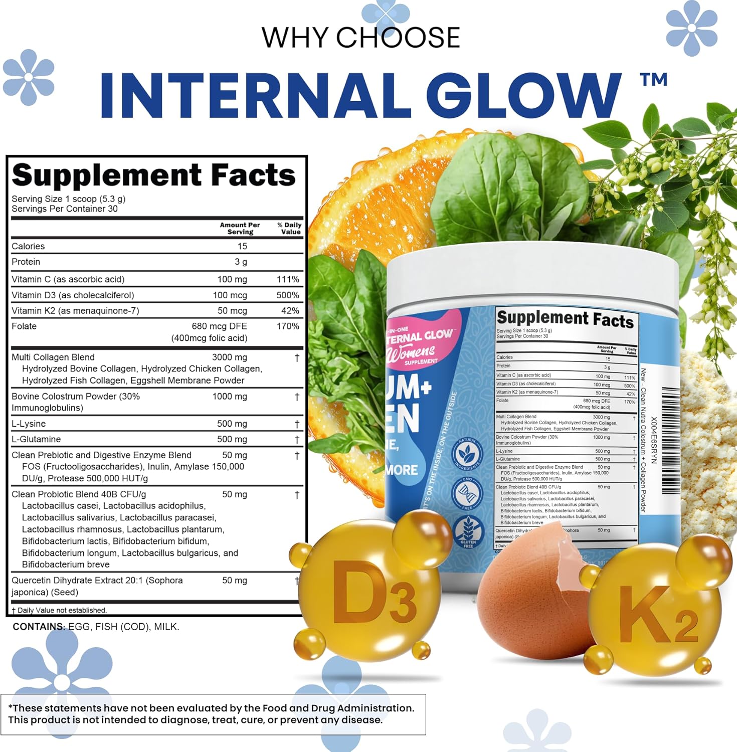 - Colostrum + Collagen Powder For Women: Bovine collagen powder features a carefully selected blend of vitamins and minerals. This multi-nutrient formula includes folate 400mcg, vitamin D3 5000 IU, L-glutamine, and quercetin complex. Colostrum supplement is a well-known ingredient, while prebiotics, probiotics for women, and digestive enzymes are included as part of a comprehensive formula.