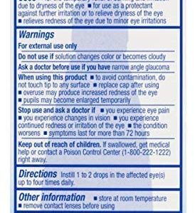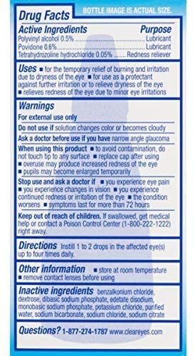 For dry, itchy red eyes, the Solution is Clear. Active Ingredients: Polyvinyl Alcohol 0.5%; Povidone 0.6%; Tetrahydrozoline Hydrochloride 0.05% Inactive Ingredients: Benzalkonium Chloride; Dextrose; Dibasic Sodium Phosphate; Edetate Disodium; Monobasic Sodium Phosphate; Potassium Chloride; Purified Water; Sodium Bicarbonate; Sodium Chloride; Sodium Citrate Uses: For the temporary relief of burning and irritation due to dryness of the eye. For use as a protectant against further irritation or to relieve dryness of the eye. Relieves redness of the eye due to minor eye irritations. Up to 8 hours of soothing comfort