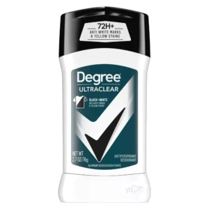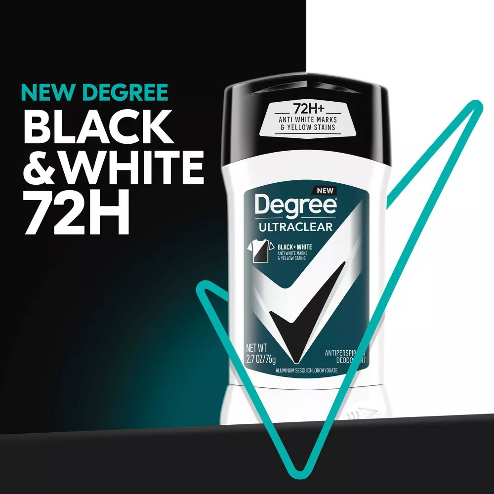 WHITE SHIRT, BLACK SHIRT, NO PROBLEM: Degree UltraClear Black+White Antiperspirant Deodorant delivers 72-hour sweat and odor protection with anti-white marks and anti-yellow stains technology.