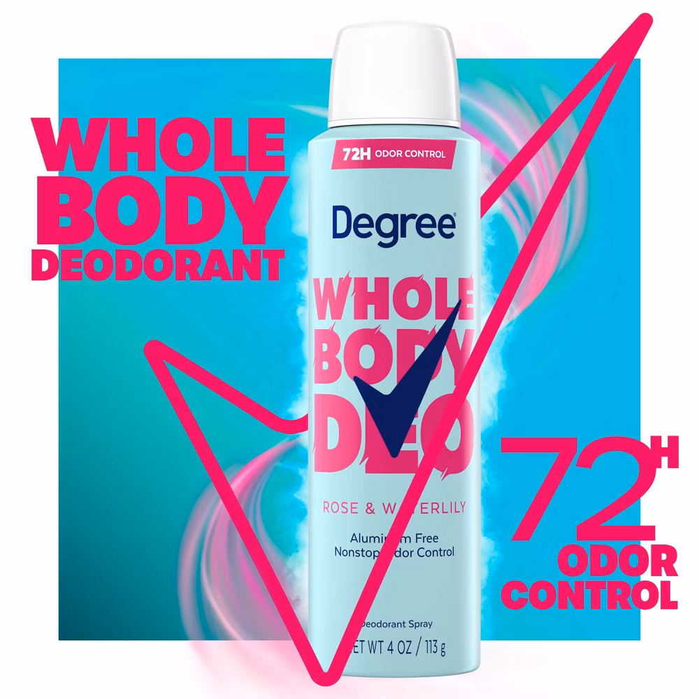 Degree Women’s Whole Body Deodorant Spray is your go-to solution for staying fresh and confident all day long. It is as affordable as it is effective: This deodorant provides up to 72 hours of odor protection, ensuring you remain unstoppable without breaking your wallet. This whole body deodorant is perfect to use anywhere you want to tackle odor, including your pits, under boobs, lower back, thighs feet and more. Features a fresh and citrus fragrance with a clean feel, making you smell amazing throughout the day. Plus, it’s dermatologist tested and aluminum free. The application is simple and easy. Hold the deodorant spray 6 inches from your skin and spray where you want to fight odor. Avoid your face and intimate areas, and let it dry. You’ll love that it leaves no residue and no white marks on your clothes, so you can wear your favorite outfits with confidence. Whether you’re hitting the gym, running errands, or just going about your day, Degree’s Whole Body Deodorant Spray keeps you feeling fresh everywhere.