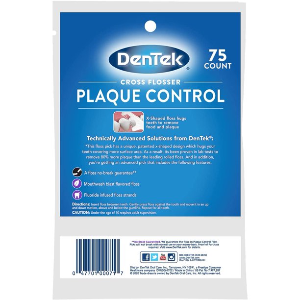 DenTek Cross Flosser Plaque Control Floss Picks feature a X-shaped floss that hugs remove food plaque. This unique Floss design removes more plaque than leading rolled floss*. DenTek Cross Flosser Plaque Control Floss Mouthwash blast infused with fluoride. While your teeth feel clean after using a toothbrush toothpaste, they’re fully clean without spaces between teeth where food plaque tend to remain