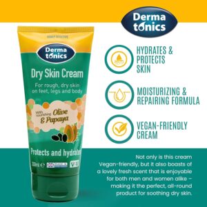 - VISIBLE RESULTS, ONE USE: Witness the transformation of dry, cracked feet, rough hands, chapped lips, and winter itchiness after just one use. Dermatonics Dry Skin Cream creates a protective layer, instantly increasing moisture levels and preventing further loss. Discover soft, smooth results.