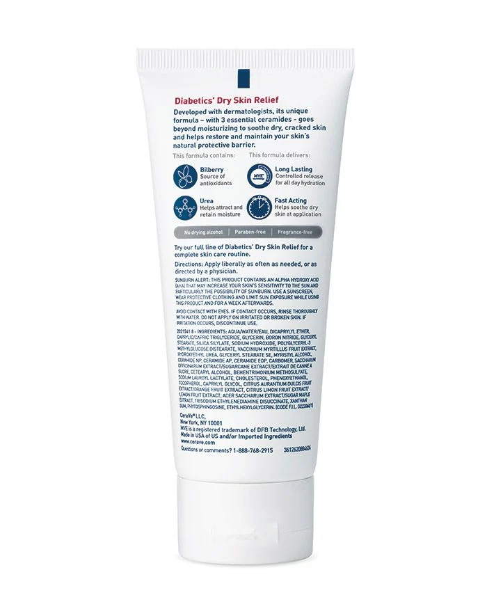 CeraVe Diabetics’ Dry Skin Relief Hand and Foot Cream was developed with dermatologists to provide soothing, 48-hour hydration for diabetics’ dry skin. Our fragrance- and paraben-free moisturizer is formulated with urea, bilberry and 3 essential ceramides that work together to lock in skins moisture and help restore your skin’s protective barrier. Patented with MVE technology to encapsulate ceramides to ensure efficient delivery within the skin’s barrier and slow release over time. Supporting your protective skin barrier, long after you’ve finish applying. 95% of diabetic testers said their skin felt immediately smoother.