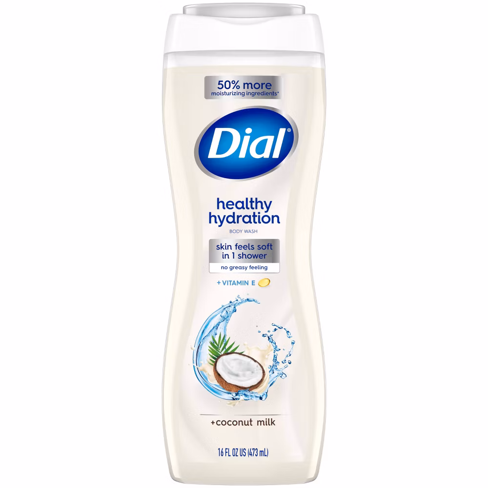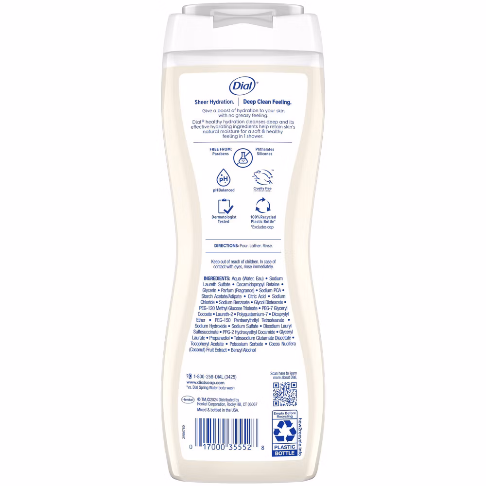 Healthy Hydration Coconut Milk Body Wash. For skin that feels refreshed, replenished and soft in 1 shower. This carefully crafted formula, with Coconut Milk and Vitamin E, is dermatologist tested, gentle on skin, and has 50% more moisturizing ingredients*. It also cleanses deep and is proven to deeply hydrate the top layers of the skin with no greasy feeling. Approved as cruelty free under the Leaping Bunny Program, and free from unwanted chemicals like parabens, silicones, and phthalates. Dial Healthy Hydration bottles are made from 100% recycled plastic, excluding cap. This package contains 16 fluid ounces of Dial body wash.