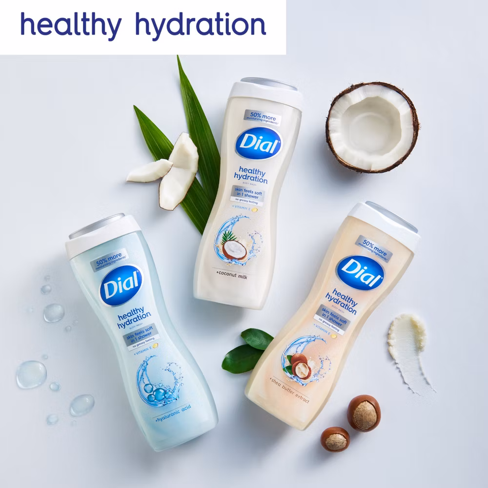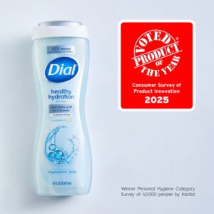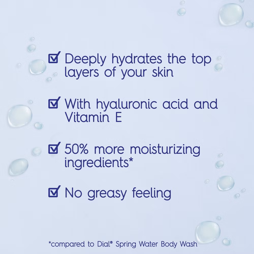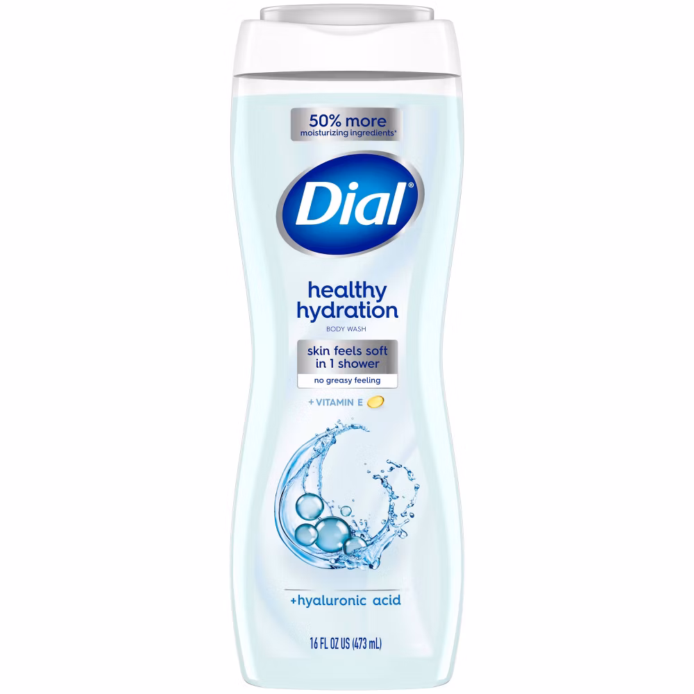 Healthy Hydration Hyaluronic Acid Body Wash.For skin that feels refreshed, replenished and soft in 1 shower. This carefully crafted formula, with Hyaluronic Acid and Vitamin E, is dermatologist tested, gentle on skin, and has 50% more moisturizing ingredients*. It also cleanses deep and is proven to deeply hydrate the top layers of the skin with no greasy feeling. Approved as cruelty free under the Leaping Bunny Program, and free from unwanted chemicals like parabens, silicones, and phthalates. Dial Healthy Hydration bottles are made from 100% recycled plastic, excluding cap. This package contains 16 fluid ounces of Dial body wash.