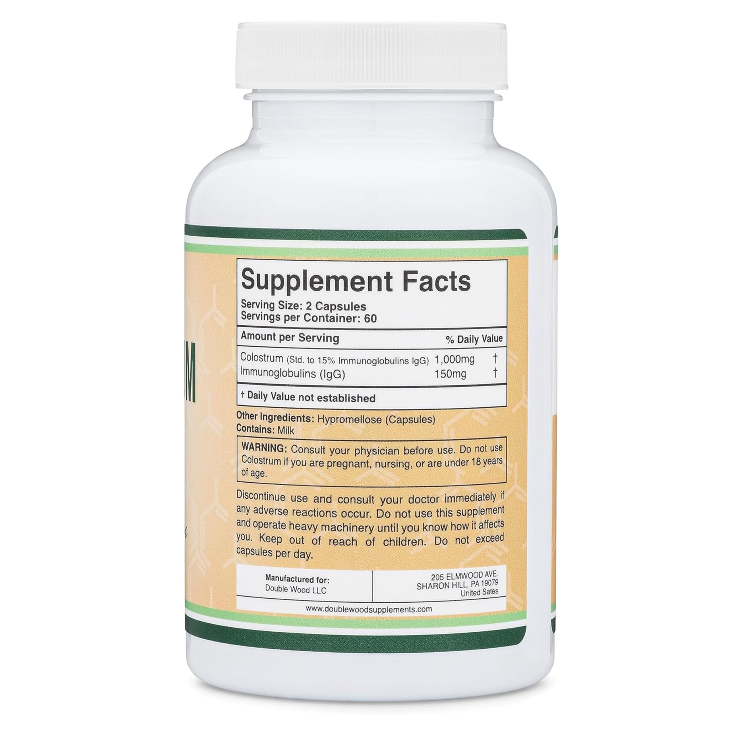 - Double Wood’s Colostrum supplement contains no fillers, is Manufactured in the USA from Globally Sourced Ingredients, is Gluten Free, and is Non-GMO