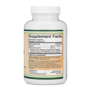 - PROVIDES 100% DAILY VALUE OF MAGNESIUM PER SERVING: Double Wood’s MAG-8 Magnesium supplement provides 426 mg of elemental magnesium per serving, which is the daily recommended value for adult males. This amount of elemental magnesium is provided by 2,300 mg of 8 different forms of magnesium