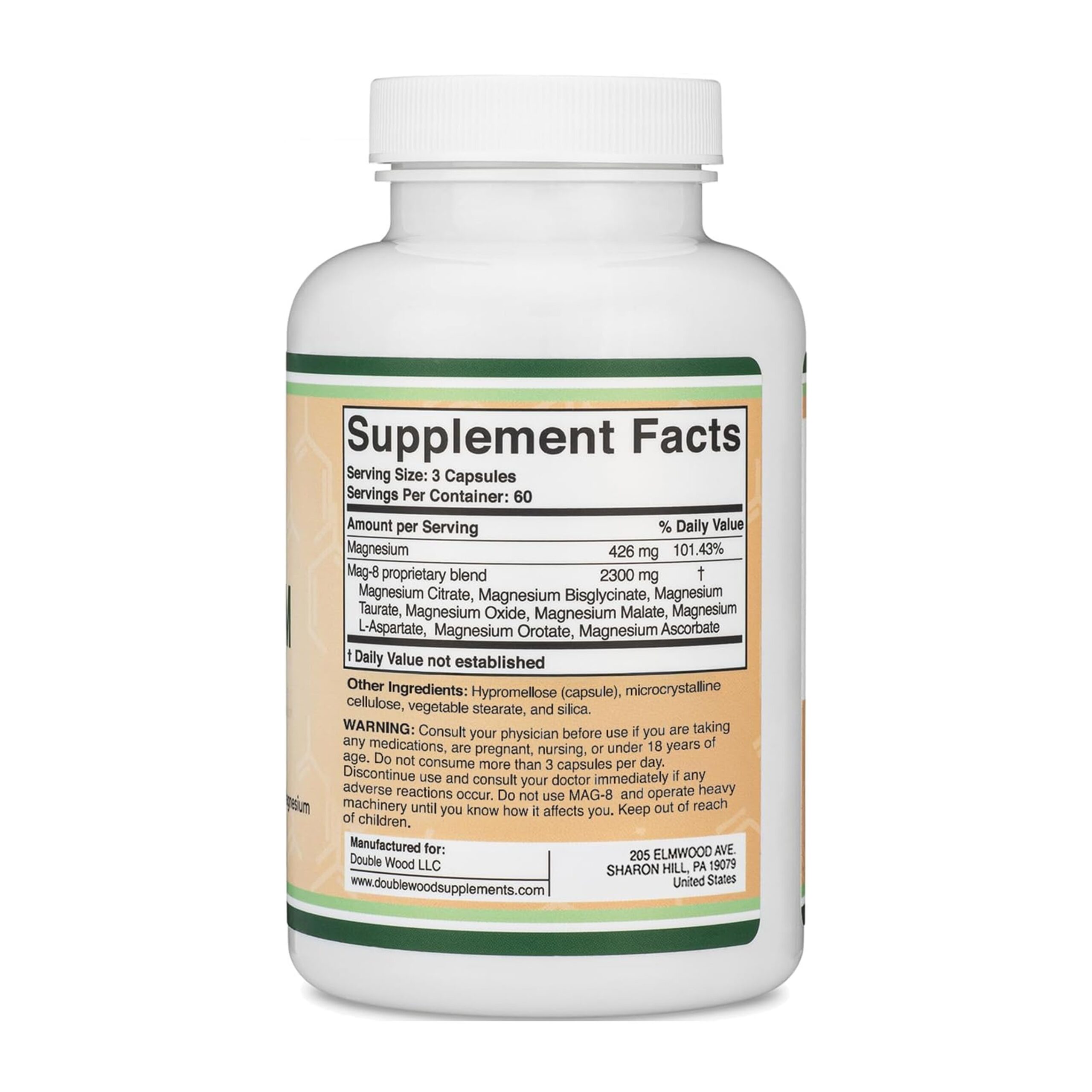 Double Wood Magnesium Complex Supplement 180 Capsules (426mg Elemental Magnesium Provided by 2,300mg of Eight Different Forms of Magnesium) MAG-8 (Packaging may Vary)