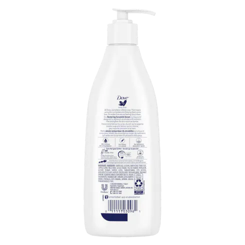 • INTENSE CARE FOR DRY SKIN: Give your body the love and care it deserves with Dove Intense Care body lotion for softer, smoother, healthier-looking skin with every application • RETAINS 9X MORE MOISTURE THAN UNTREATED SKIN: Body moisturizer beautifully nourishes dry skin and provides long-lasting, 48-hour moisturization • INFUSED WITH RESTORING CERAMIDE SERUM: The unique blend of ingredients in Dove Intense Care body lotion is designed to replenish ceramides with nutrients that strengthen the skin’s moisture barrier • DERMATOLOGIST-APPROVED: This fast-absorbing, non-greasy, and paraben-free moisturizer for dry skin provides long-lasting care • MAKE EVERY BODY CARE MOMENT COUNT: Use this body lotion after a bath or shower with Dove Deep Moisture Body Wash for softer and smoother skin that lasts
