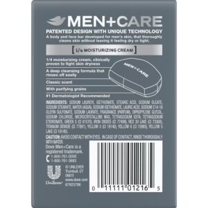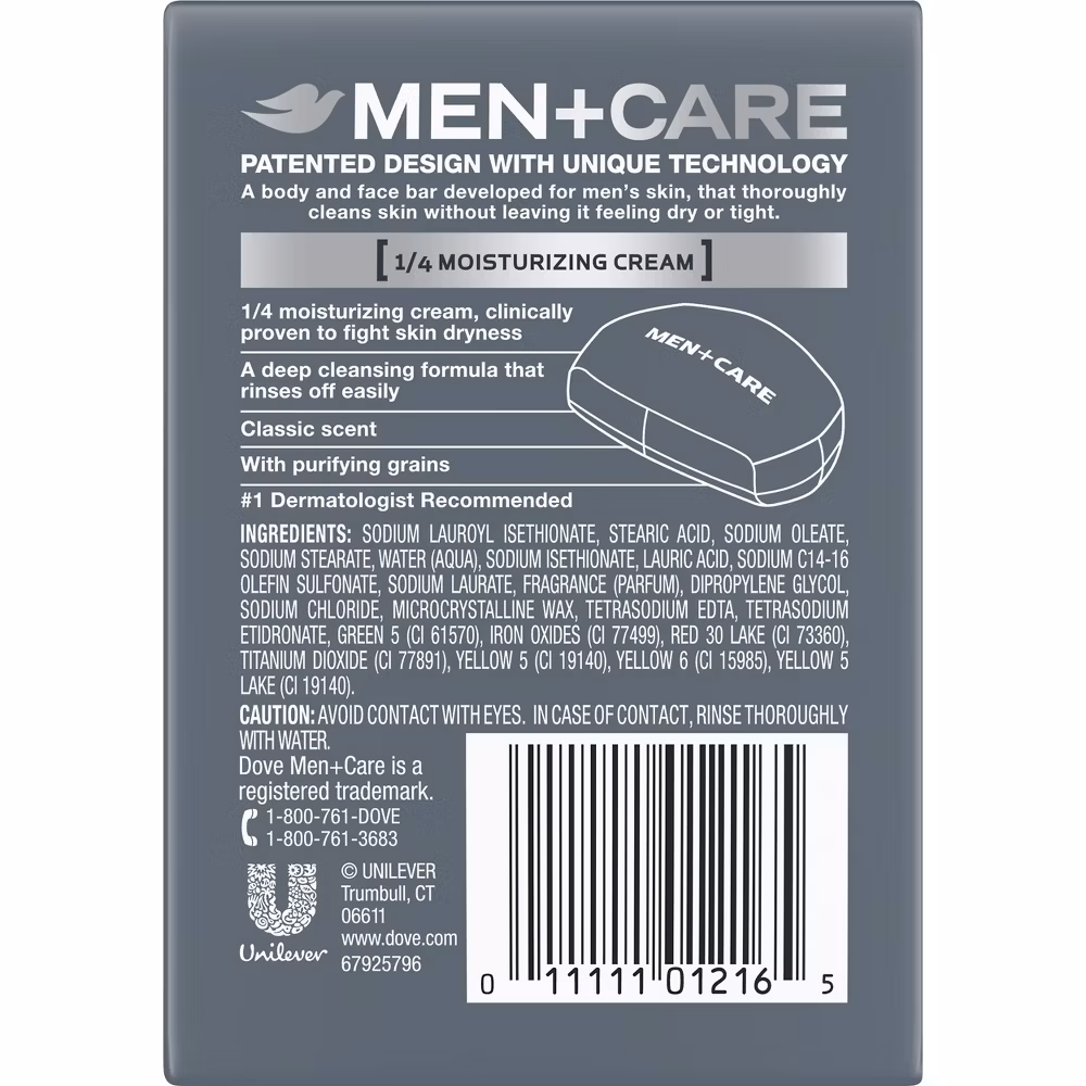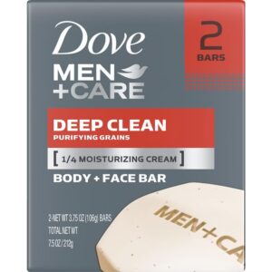 Looking for a bar soap for men that cleanses while also helping protect from dry skin? Dove Men+Care Deep Clean Body and Face Bar contains purifying grains and delivers a deep, refreshing clean that leaves skin feeling hydrated and strong. Dove Men+Care Body and Face Bar effectively washes away bacteria, nourishes your skin. Body and face soap bar goes beyond just delivering a deep clean: it helps to protect skin from feeling tight and dry with its unique formula made for men’s skin. With ¼ moisturizing cream, the Dove Men+Care Deep Clean Body and Face Bar nourishes for skin that feels healthy and strong. This #1 Dermatologist Recommended body soap and face soap bar helps to maintain skin’s hydration levels and protect skin against dryness. Regular men’s bar soap can often leave skin feeling tight and dry, but Dove Men+Care Deep Clean Body and Face Bar helps maintain skin’s moisture to provide skin comfort and refreshment. Plus, its formula is non-comedogenic and mild and gentle enough to use on your face. To use Dove Men+Care Deep Clean Body and Face Bar, wet the body bar in the shower and massage into your face and body to create a light foam before rinsing thoroughly. The lather rinses cleanly away without leaving behind a greasy feel. Dove Men+Care Deep Clean Body and Face Bar has a classic scent, and is clinically proven to fight skin dryness. This body bar not only cleanses, but also leaves your skin feeling healthy and strong.