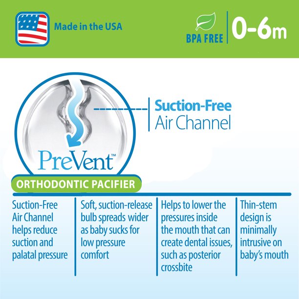 - ORTHODONTIC PACIFIER. Designed by a pediatric dentist, this newborn pacifier has a 100% silicone bulb that features a patented suction-free air channel and thin bulb stem that reduce pressure inside baby’s mouth, helping prevent dental issues such as posterior crossbite.