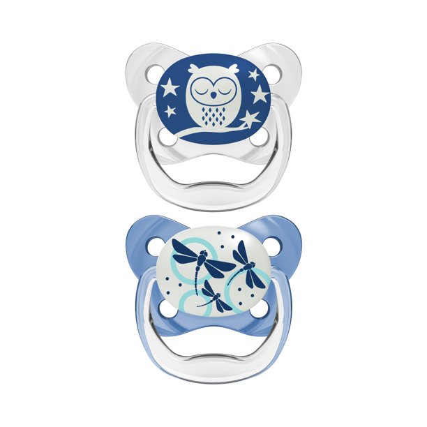 Safe soothing has never been smarter! Dr. Brown’s® PreVent™ Pacifiers are as adorable as they are effective. Designed by a pediatric dentist, the 100% silicone bulb features a patented suction-free air channel and thin bulb stem that reduce pressure inside baby’s mouth, helping prevent dental issues such as posterior crossbite down the road. The glow-in-the-dark pacifier is easy to locate at night and is easy to recharge – just expose to light. Prevent Pacifiers have a size for every age, ranging from 0m to 18m. The bulb is taste-free, odorless, and keeps its unique shape over time. The Contoured Shield curves away from baby’s face to reduce the risk of pacifier rash on little cheeks and noses. Prevent Pacifiers are easy to clean and are dishwasher (top rack) and sterilizer safe. Electric sterilization and boiling water only – do not sterilize baby pacifiers in the microwave.