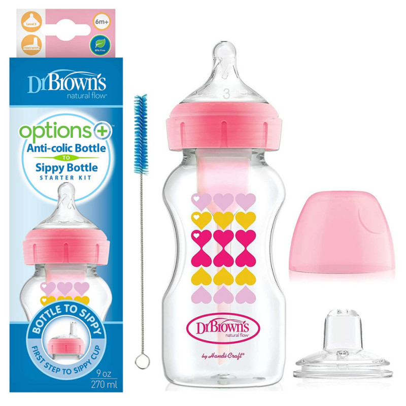 Includes an 9 oz./270 ml Options+ Wide-Neck bottle, level 3 nipple and a sippy spout. Spout fits 5 oz./150 ml and 9 oz./270 ml Dr. Brown’s Options+ Wide-Neck bottles. Transition from bottle to cup with nipple-to-sippy conversion kit. Soft, 100% silicone spout is gentle on little mouths. Easy to clean – dishwasher (top rack) and sterilizer safe; BPA free. 6m+. For Kids from 6 months to 1 year. BPA free, dishwasher (top rack) and sterilizer safe