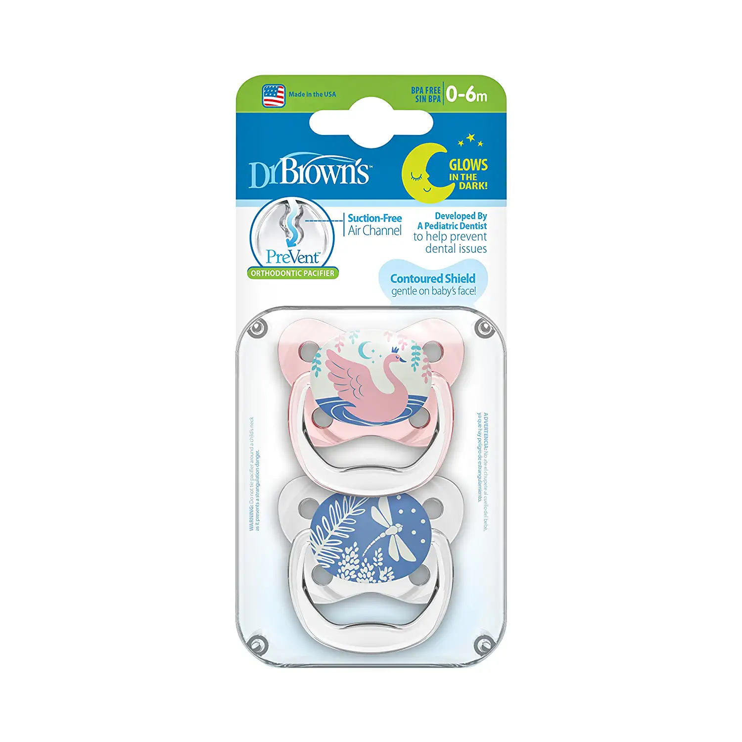 Safe soothing has never been smarter! Dr. Brown’s PreVent Pacifiers are as adorable as they are effective. Designed by a pediatric dentist, the 100% silicone bulb features a patented suction-free air channel and thin bulb stem that reduce pressure inside baby’s mouth, helping prevent dental issues such as posterior crossbite down the road. The glow-in-the-dark pacifier is easy to locate at night – just expose to light to utilize the glow-in-the-dark feature! Prevent Pacifiers have a size for every age, ranging from 0m to 18m. The bulb is taste-free, odorless, and keeps its unique shape over time. The Contoured Shield curves away from baby’s face to reduce the risk of pacifier rash on little cheeks and noses. Prevent Pacifiers are easy to clean and are dishwasher (top rack) and sterilizer safe. Electric sterilization and boiling water only – do not sterilize baby pacifiers in the microwave.