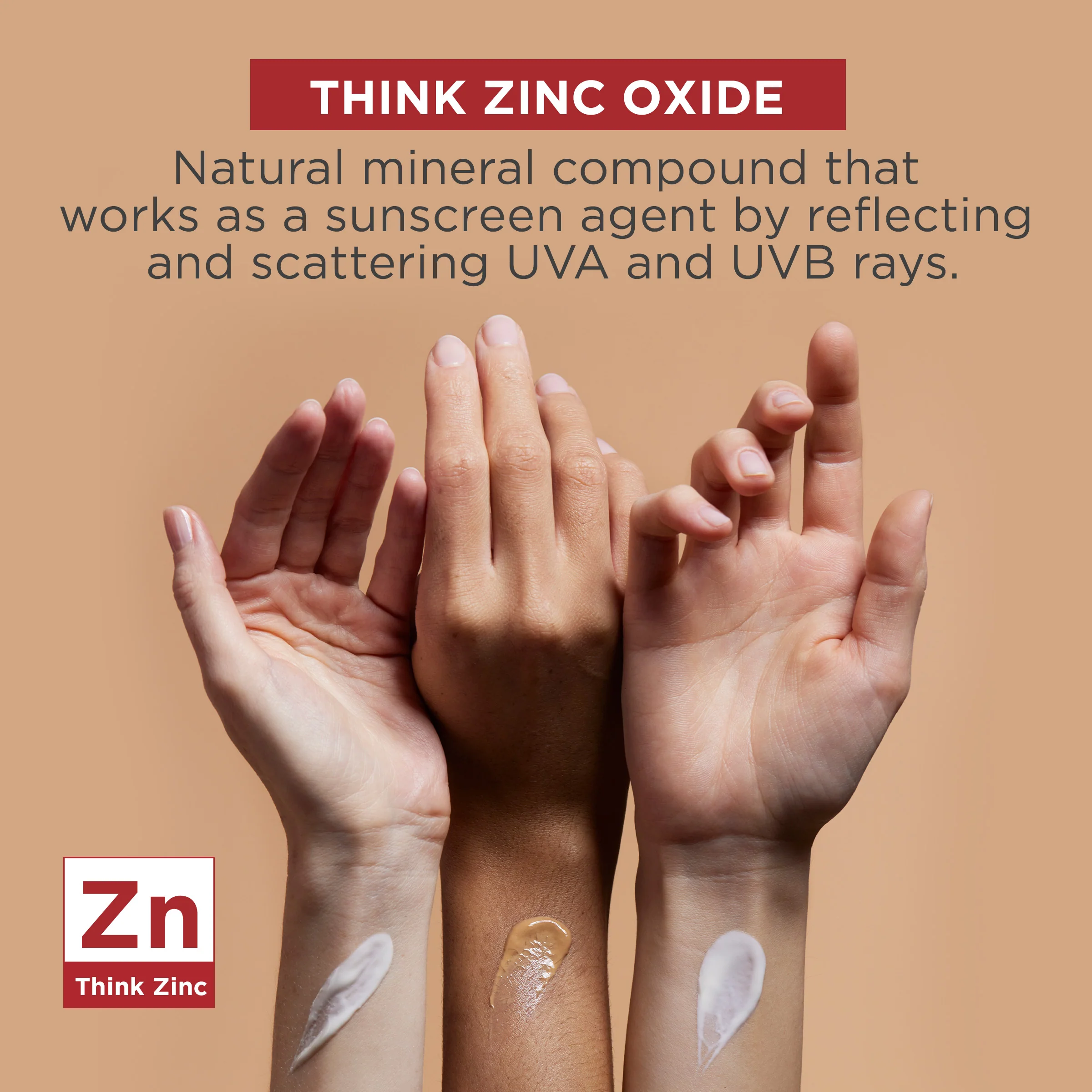 Zinc Oxide: Natural mineral compound that works as a sunscreen agent by reflecting and scattering UVA and UVB rays