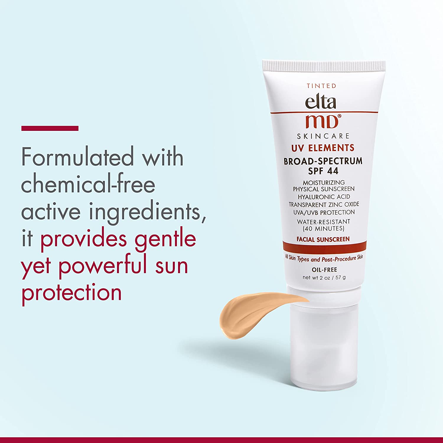 Oil-free EltaMD UV Elements facial sunscreen is a physical sunscreen in a tinted, moisturizing base. Zinc oxide and titanium dioxide provide mineral-based sun protection in a moisturizing and water-resistant formula.Fragrance free