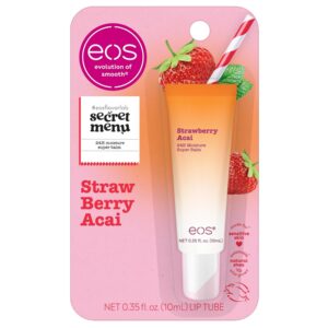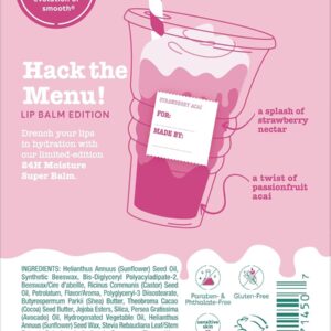 Introducing new, limited-edition #eosflavorlab Secret Menu – a drink-inspired lip balm collection! The refreshing Strawberry Acai flavor tastes like the ultimate summer refresher—sweet strawberry nectar with tangy passionfruit acai. More than just an ordinary lip balm, this deeply conditioning treatment provides hydration & moisturizing with 24-hour moisture and ultra-protective care. Made with a rich blend of cocoa, shea, and avocado butters, it soothes and smooths dry lips for lasting comfort, day or night. Dermatologist recommended and crafted with sustainably sourced ingredients, this Super Balm delivers luxurious hydration and protection for irresistibly soft, healthy lips with every swipe.