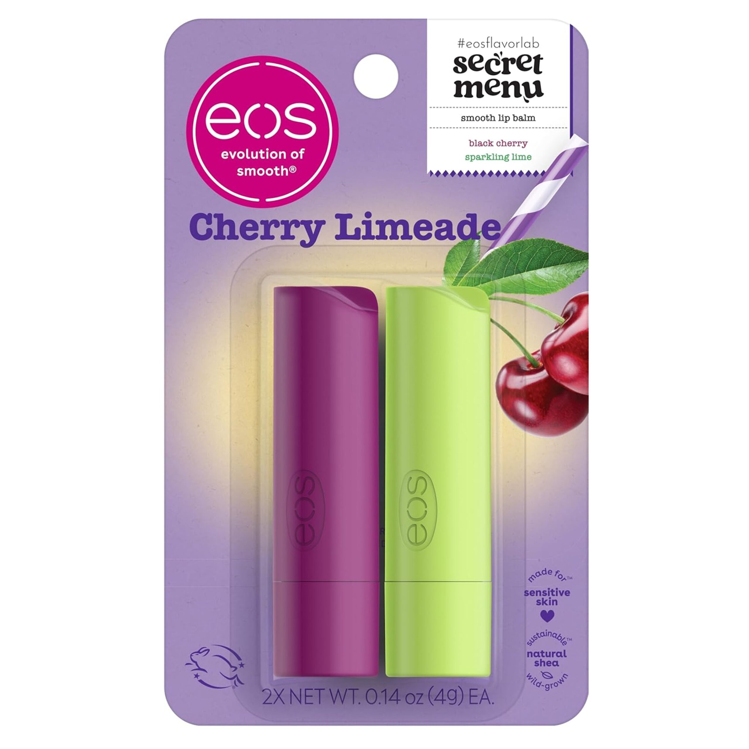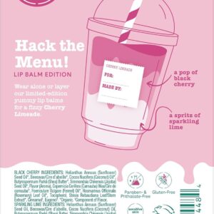 Introducing new, limited-edition #eosflavorlab Secret Menu – a drink-inspired lip balm collection! This refreshing Cherry Limeade set features Black Cherry and Sparkling Lime, capturing the perfect balance of fizzy, fruity flavor. Black Cherry delivers the rich, jammy taste of farmer’s market cherry preserves, while Sparkling Lime brings the crisp essence of key lime seltzer with muddled red berries. Wear them alone or layer them together for a bold, tangy twist. Infused with soothing shea butter, weightless coconut oil, and protective antioxidants, these dermatologist-recommended balms provide all-day hydration for soft, smooth lips. Made with sustainably sourced ingredients, they deliver luxurious moisture with a bright, juicy finish. Pucker up for a burst of cherry-lime bliss in every swipe.