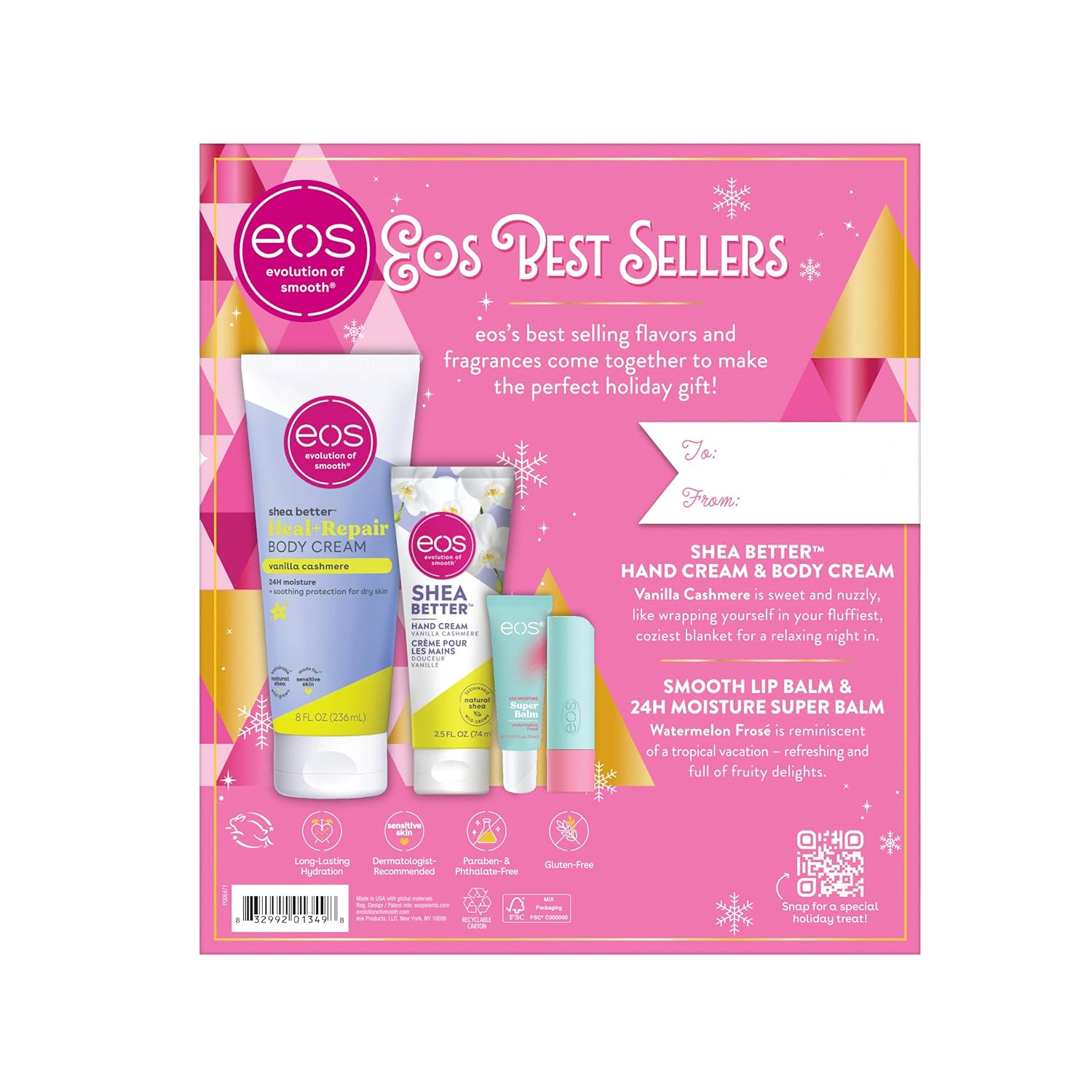 eos’s best selling flavors and fragrances come together to make the perfect holiday gift! Perfect for gift giving, stocking stuffers, or enjoying for yourself! We pack our products with natural and sustainably-sourced ingredients like soothing shea butter, weightless coconut oil and protective antioxidants. These high-quality ingredients protect and lock in moisture all-day long and are made with the most delicious holiday scents that will have you re-applying again and again. eos is a skin care brand you can trust! Our products are cruelty-free, paraben-free, phthalate-free, and gluten-free.