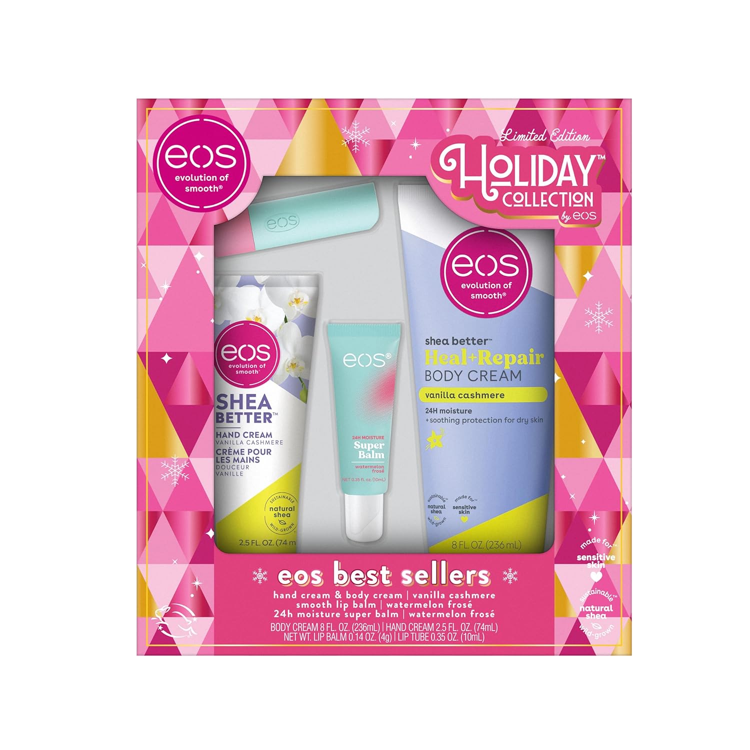 eos Holiday Skin Care Gift Set- Vanilla Cashmere Body & Hand Cream, Watermelon Frosé Lip Butter & Balm, Made for Sensitive Skin, 4-Pack