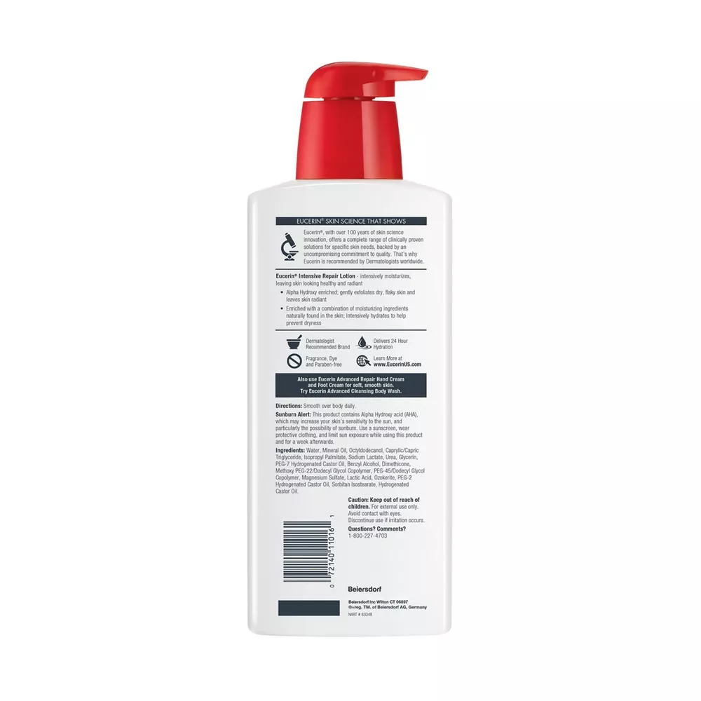 Eucerin Intensive Repair Body Lotion immediately restores skin’s radiance and delivers 24 hour hydration. This Eucerin Intensive Repair lotion contains a unique 3-dimensional formula that is enriched with Alpha Hydroxy and Natural Moisturizing Factors, and moisturizes, exfoliates and conditions very dry, flaky skin. The intensively moisturizing formula in this unscented body lotion immediately improves skin’s appearance. This fragrance free body lotion for dry skin is dye and paraben free, so it’s ideal for those with sensitive skin, and is gentle enough for use as a daily dry skin repair lotion. This body moisturizer is perfect as a very dry skin lotion, and can also be used as a hand lotion or foot lotion. To use, smooth this Eucerin sensitive skin lotion onto your body daily. Eucerin is a dermatologist-recommended skincare brand that is based on an uncompromising approach to science.