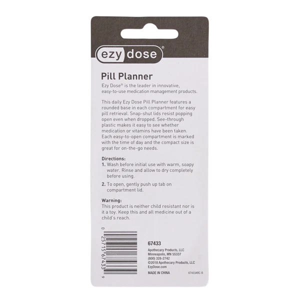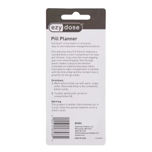 The Ezy Dose AM/PM organizer and pill reminder helps you remember your daily medications with ease. Two individual large compartments hold all your medications or vitamin needs. The snap-shut lids are designed to resist popping open even when dropped. Made of translucent, durable plastic so you can tell if you took your medication without opening the lid. Each compartment features a rounded base which makes it easier to retrieve your medication. Compact size fits in your pocket, purse, or briefcase.