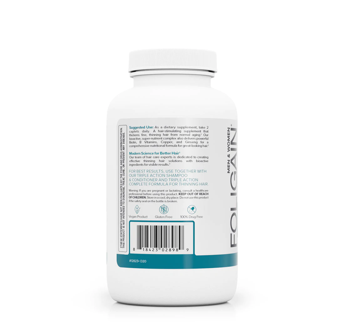 Our FOLIGAIN® Stimulating Supplement for Thinning Hair supports a thicker appearance for fine, thinning hair from the inside out. Our bioactive super-nutrient complex with powerful biotin, B vitamins, copper and ginseng work together to support noticeably fuller-looking, healthier-looker hair.