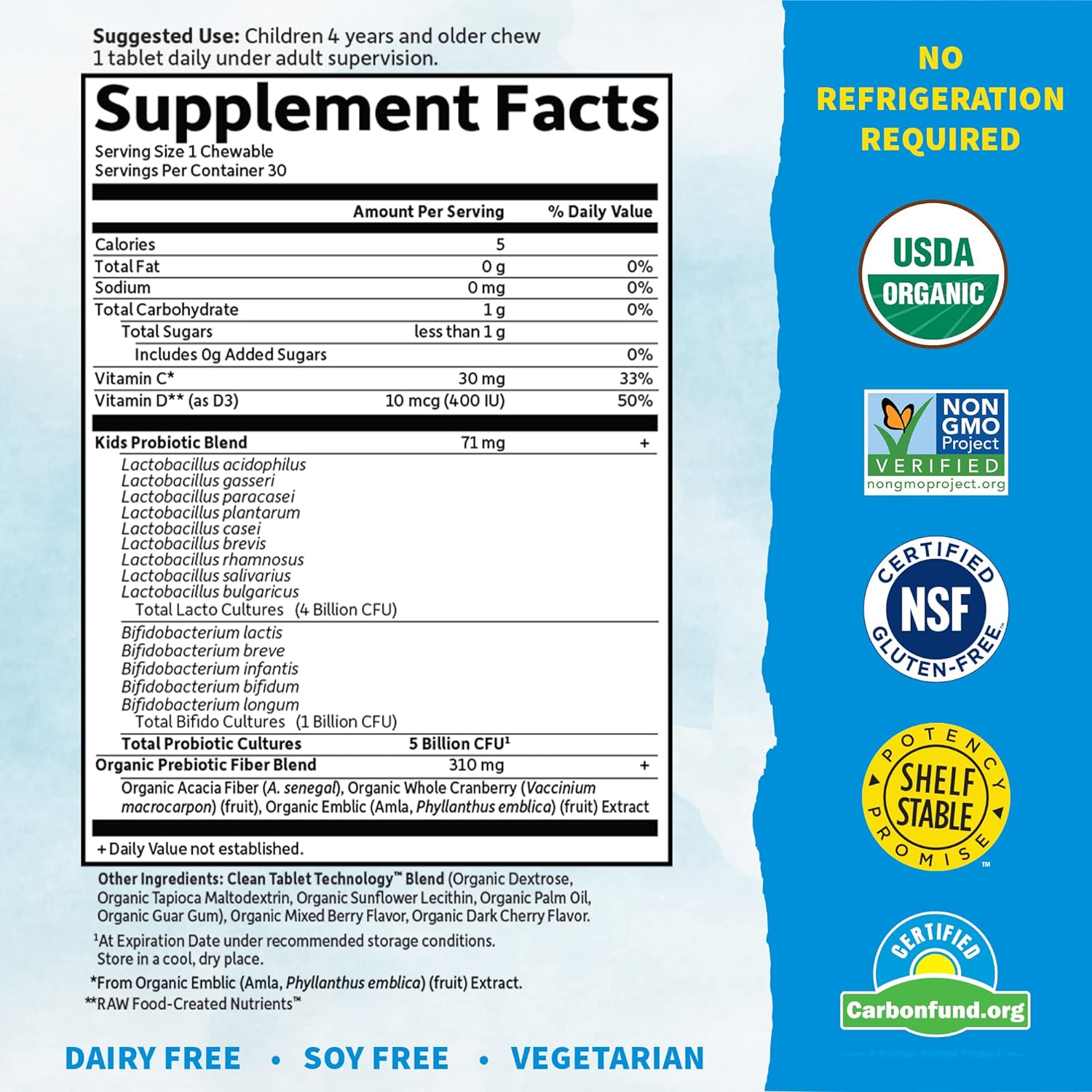 - Vitamin C from organic Amla (30mg); vitamin D (400IU) and prebiotic fiber