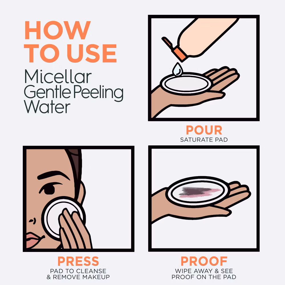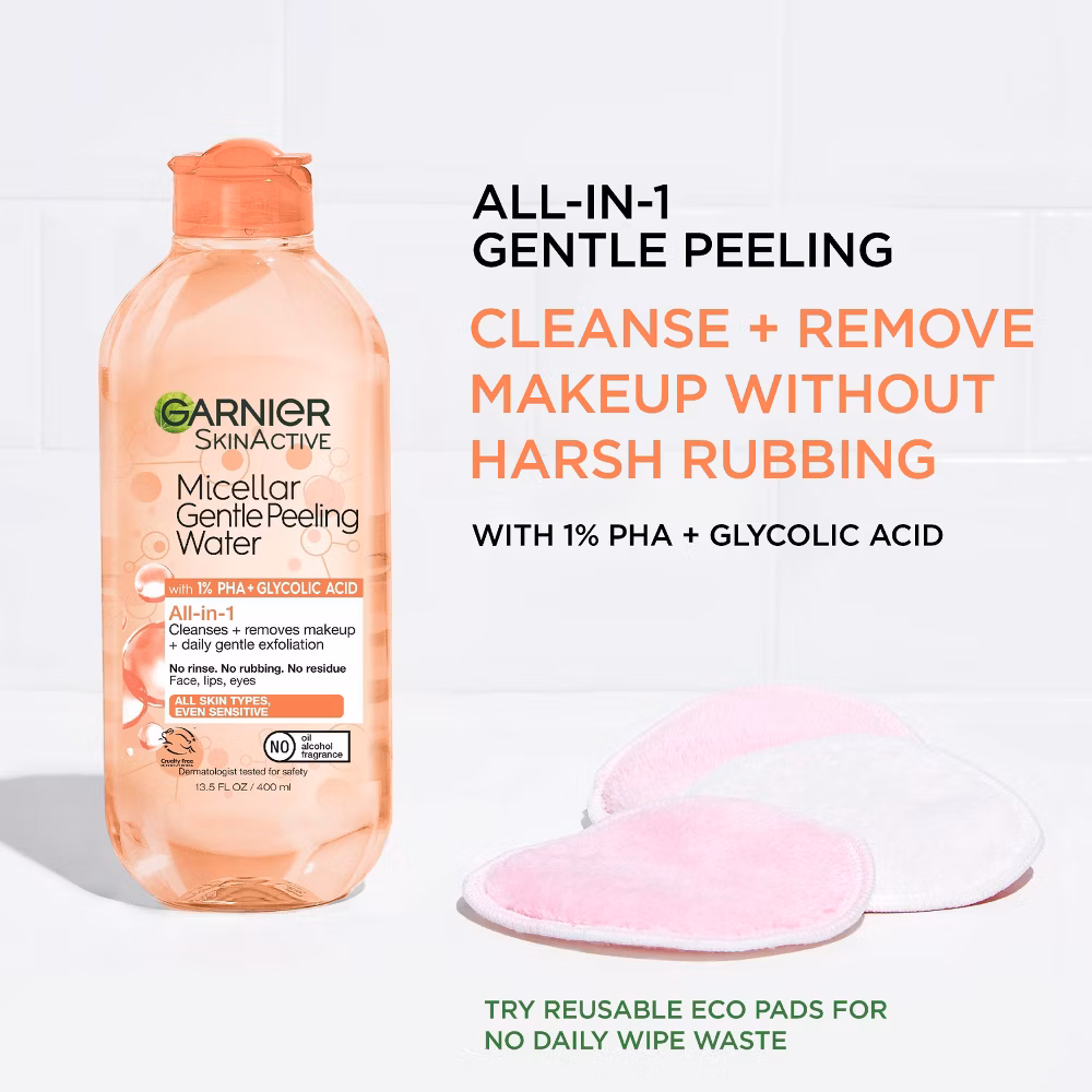 Garnier Skinactive Micellar Gentle Peeling Water with 1% PHA and Glycolic Acid: Use this gentle yet powerful all in one exfoliating face wash, makeup remover to remove stubborn makeup, gently cleanse, and leave skin looking healthy and smooth