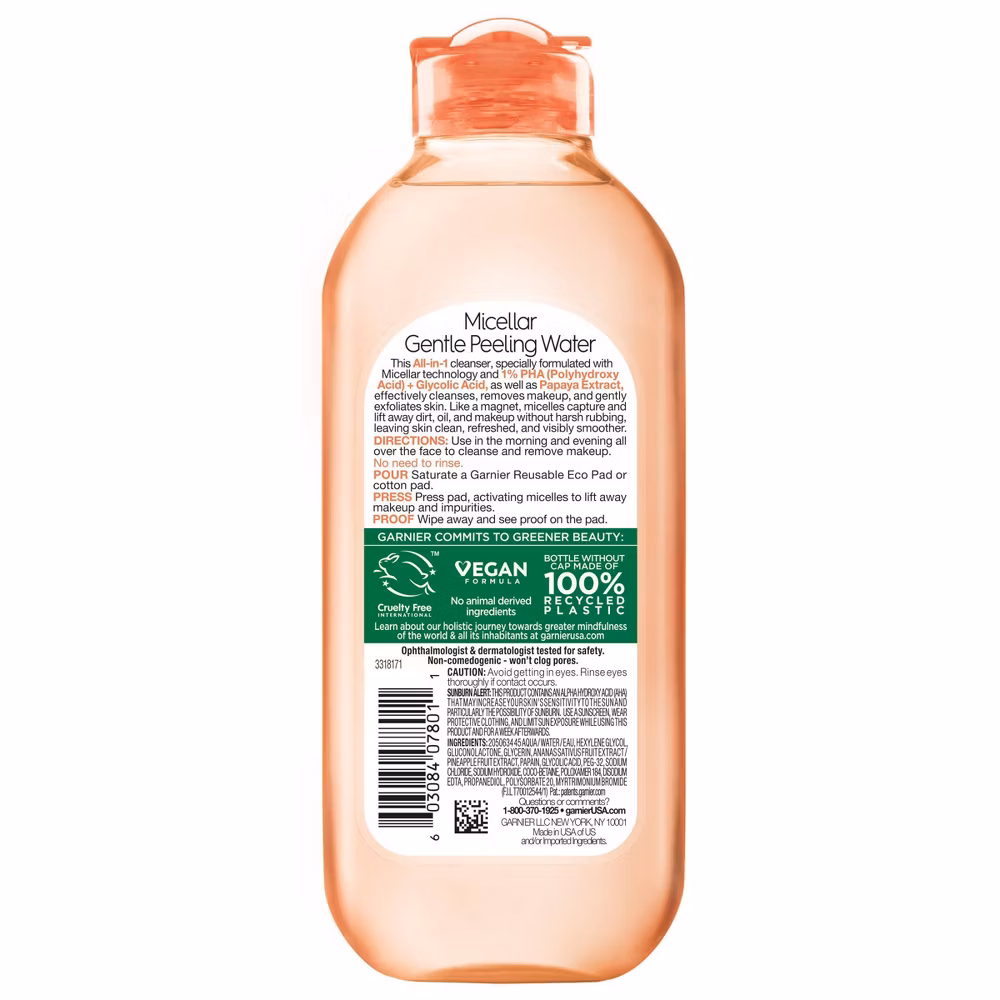Garnier’s all-in-1 exfoliating cleanser for visibly healthy glowing skin. This all-in-1 exfoliating micellar gentle peeling water is a facial cleanser and eye makeup remover that is gentle on skin. The Garnier Micellar Gentle Peeling Water with 1% PHA and Glycolic Acid, removes makeup and gently exfoliates skin improving skin smoothness and tone. Use as an exfoliating facial cleanser in the morning and as a gentle makeup remover at night; can also be used as an exfoliating toner. Removes mascara better than the leading face makeup wipes*. This gentle cleanser is approved by Cruelty-Free International, vegan, oil-free, paraben-free, fragrance-free, sulfate-free and silicone-free. Suitable for all skin types, even sensitive.